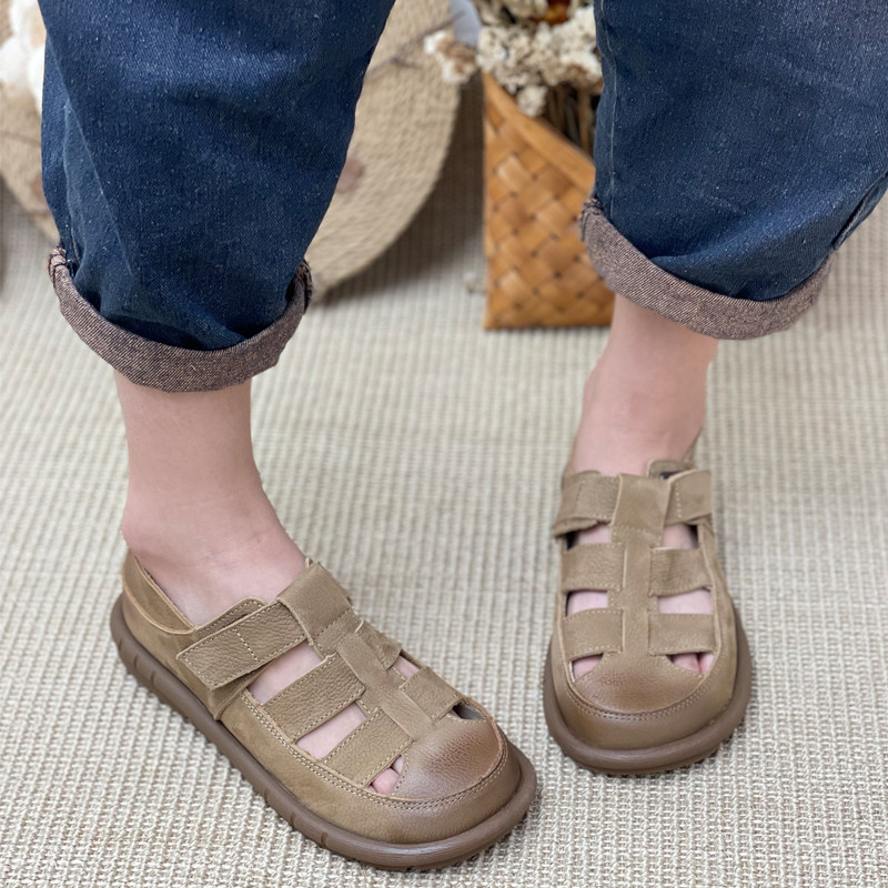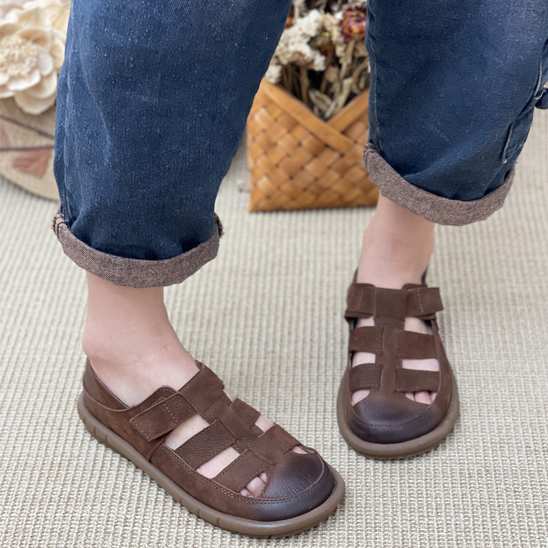 女2023年夏季 新款 镂空平底包头防滑复古女鞋 真皮罗马凉鞋 子妈妈鞋