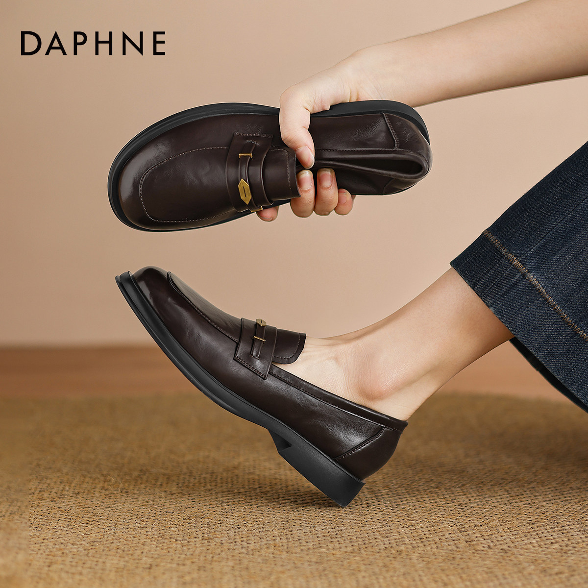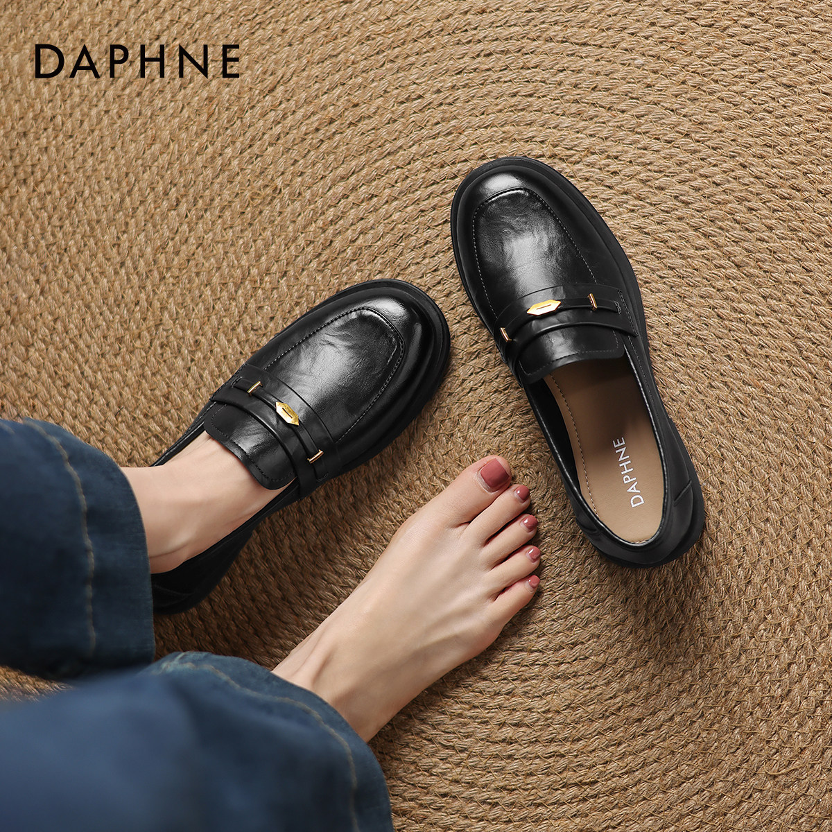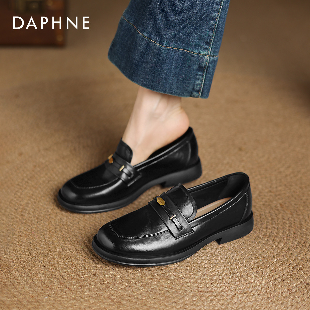 女2026新款 秋季 软底英伦风小皮鞋 达芙妮黑色乐福鞋 女通勤平底单鞋