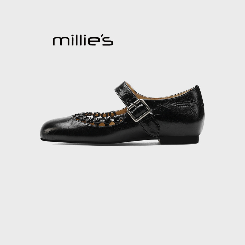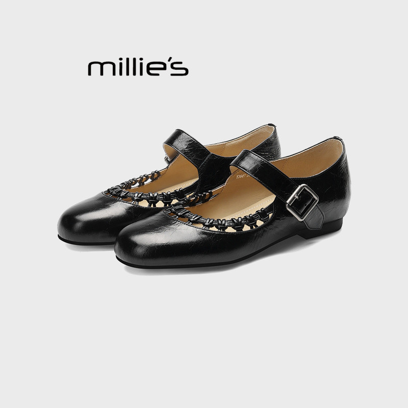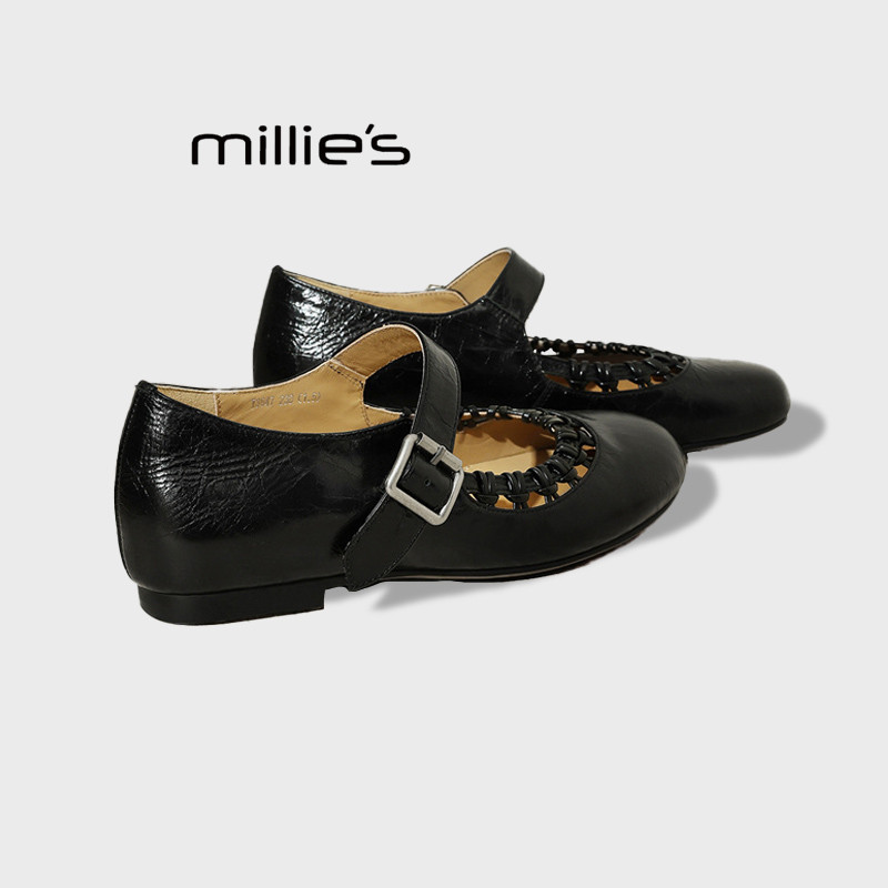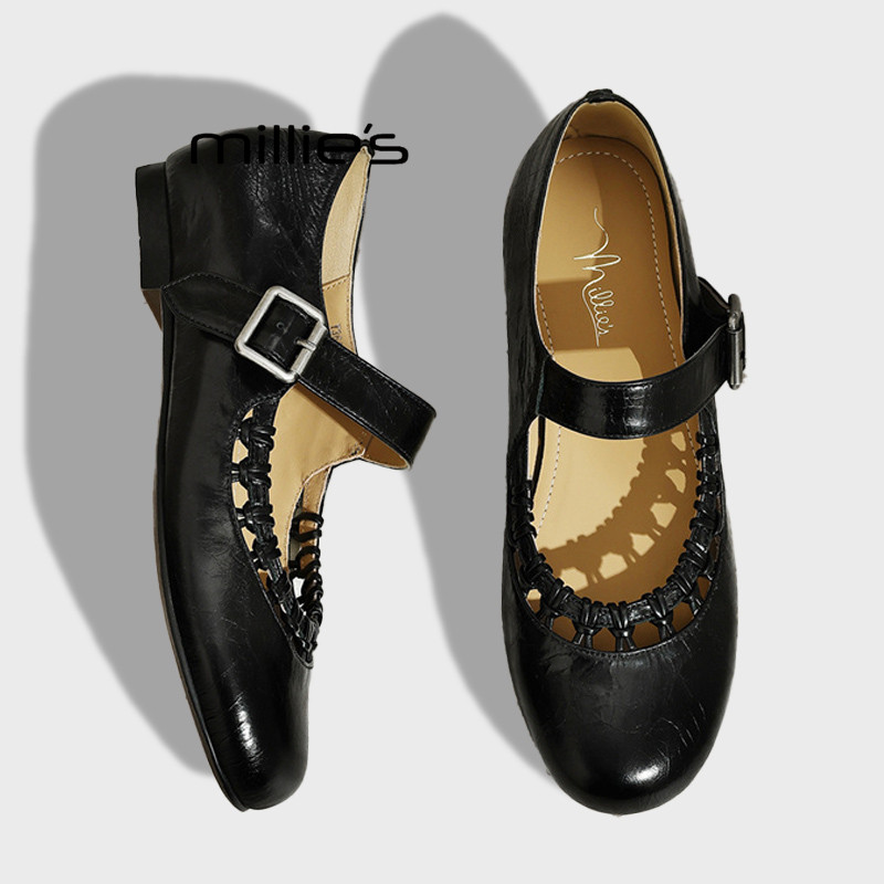 一字带扣镂空花边黑色小皮鞋 MILLIE 复古玛丽珍鞋 春季 妙丽法式
