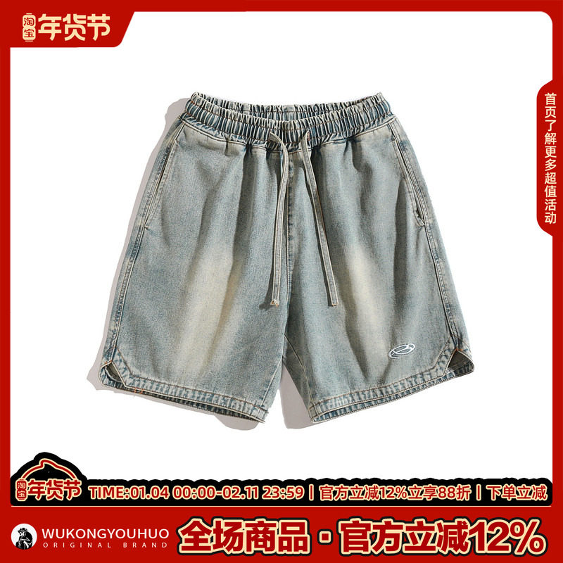 男潮牌嘻哈街头宽松阔腿五分裤 悟空有货美式 复古水洗直筒牛仔短裤
