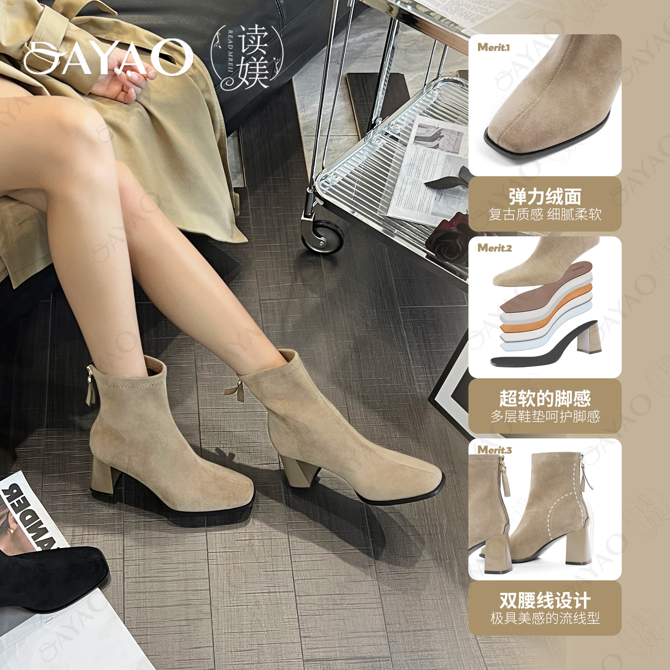 大尧大美丽瘦瘦靴7cm方头粗跟女冬季 新款 绒面拉链软底短靴3113