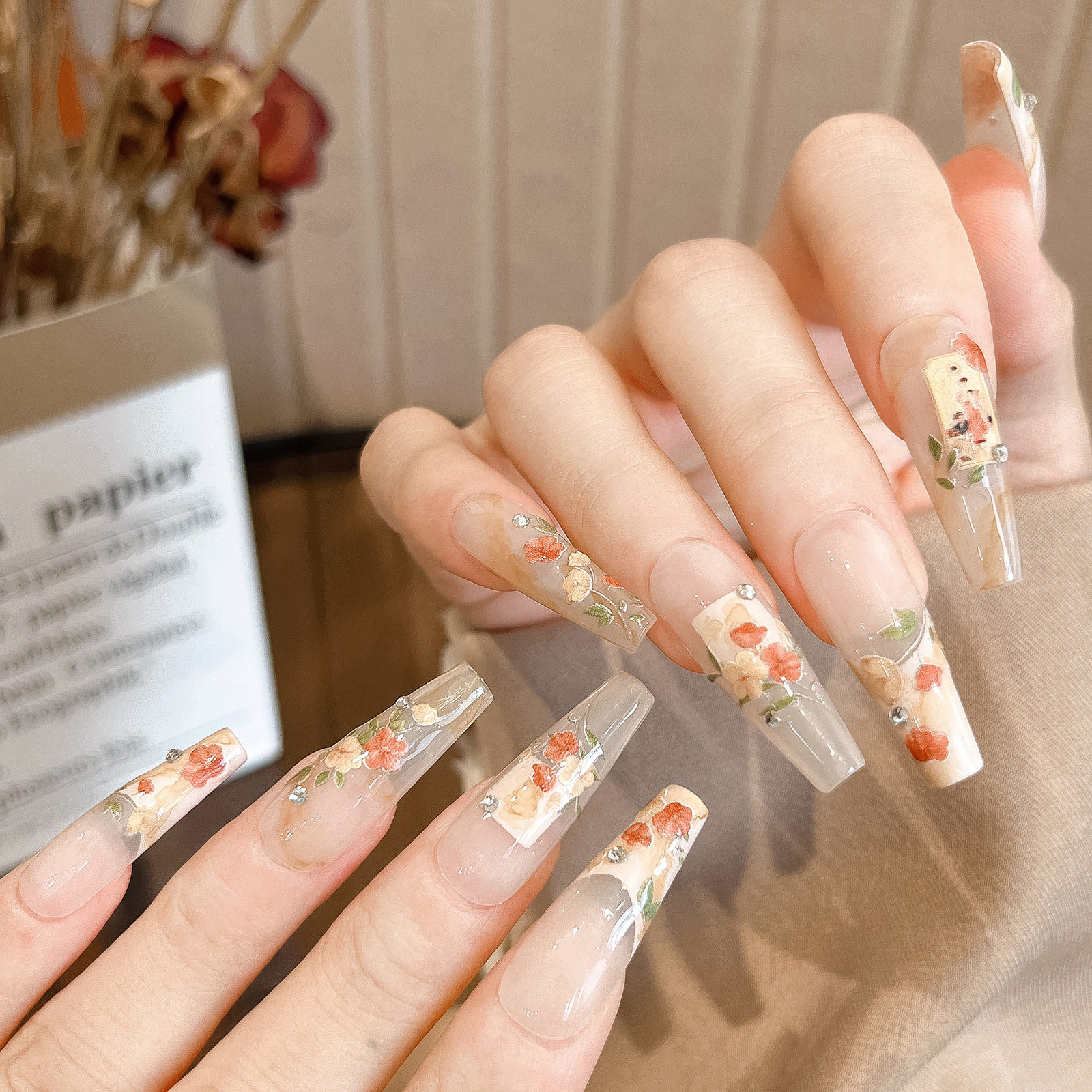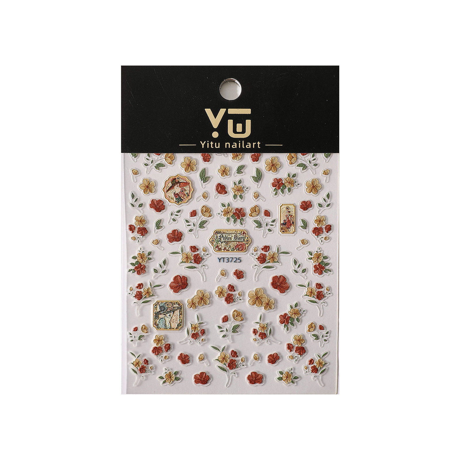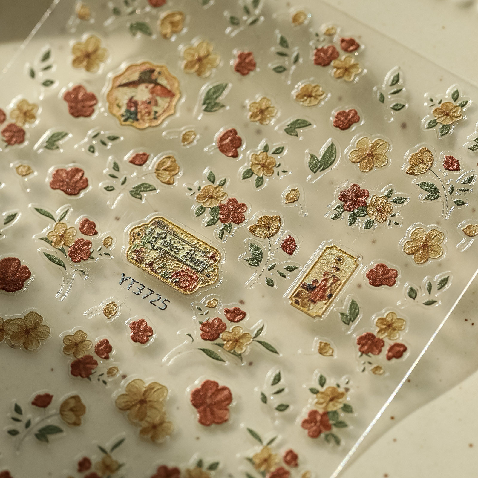 新款 园林风法式 复古花朵美甲贴纸浮雕格纹精致相框指甲背胶贴