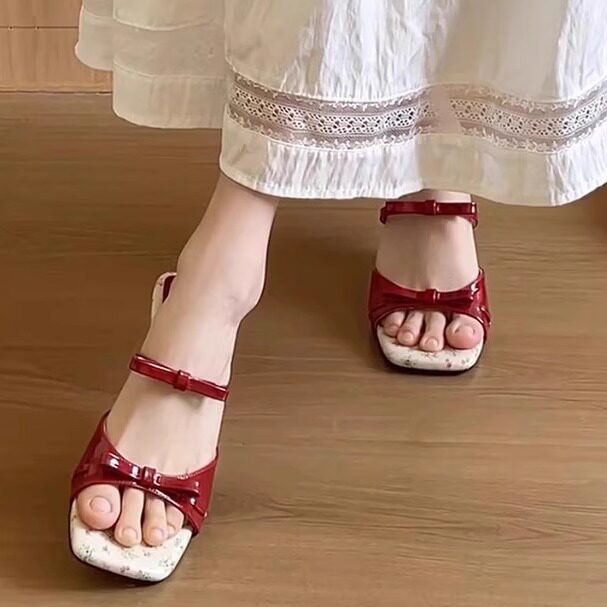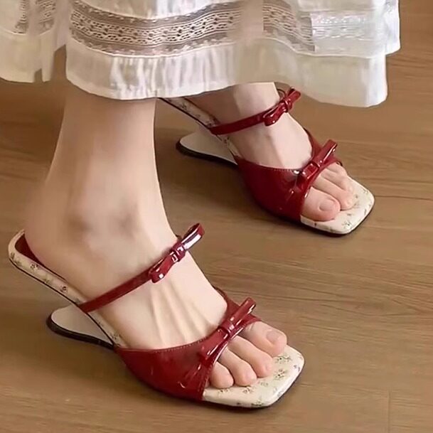 女夏季 外穿2025新款 方头凉拖鞋 碎花蝴蝶结坡跟凉鞋 配裙子高跟拖鞋