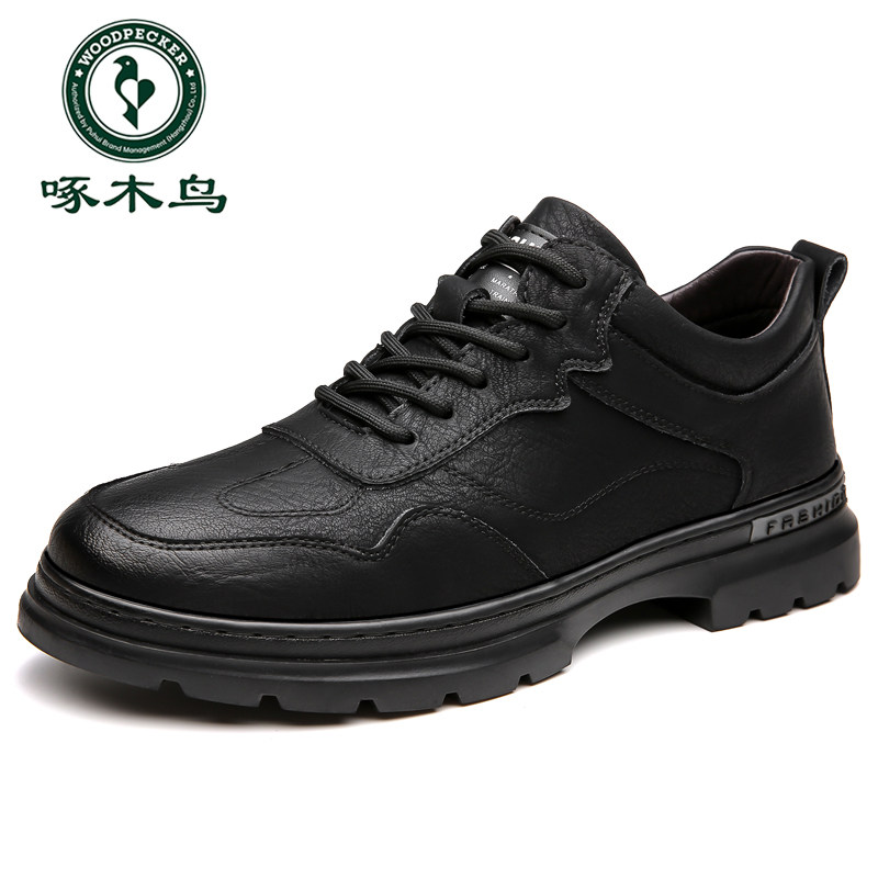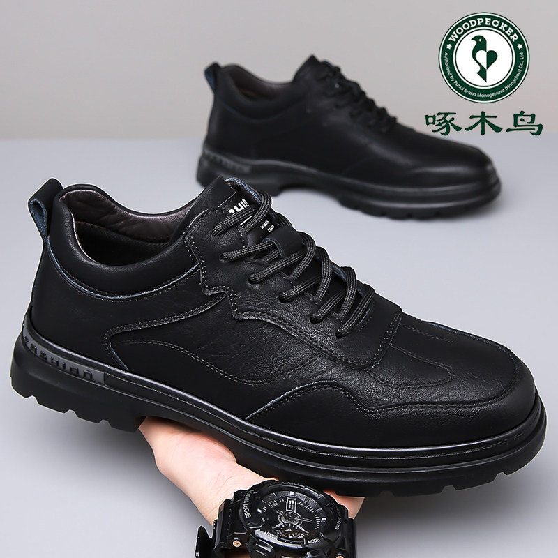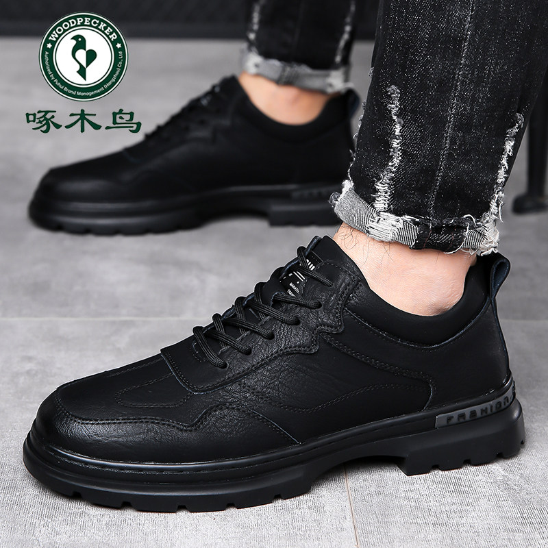 软底运动休闲鞋 啄木鸟男鞋 潮流百搭黑色商务皮鞋 男士 2024春季 新款