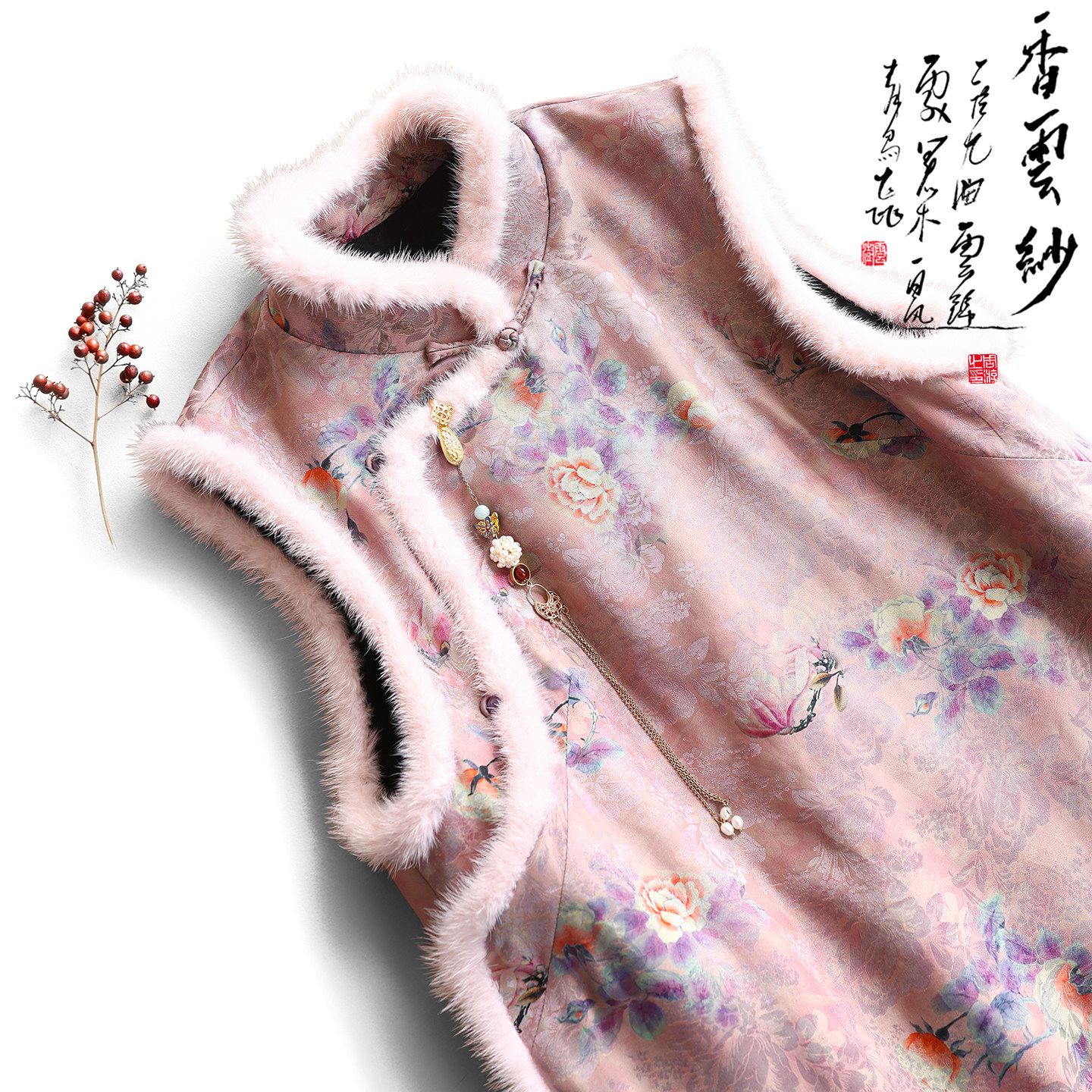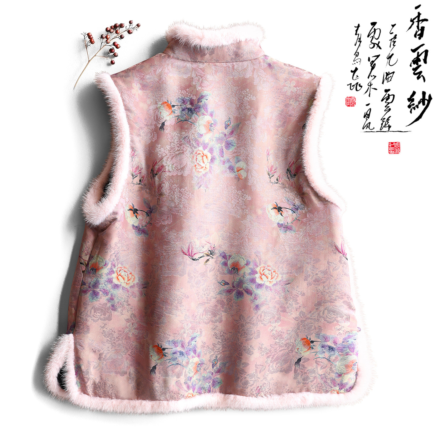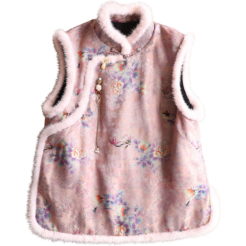 云澍原创交织香云纱新中式 温柔国风水貂毛立领棉服马甲上衣女冬季