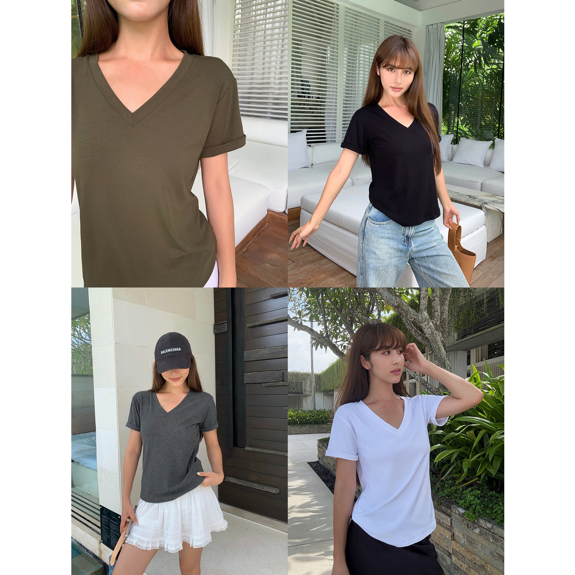 NEVA t恤女简约宽松显瘦气质针织正肩上衣 白色v领短袖 纸片人