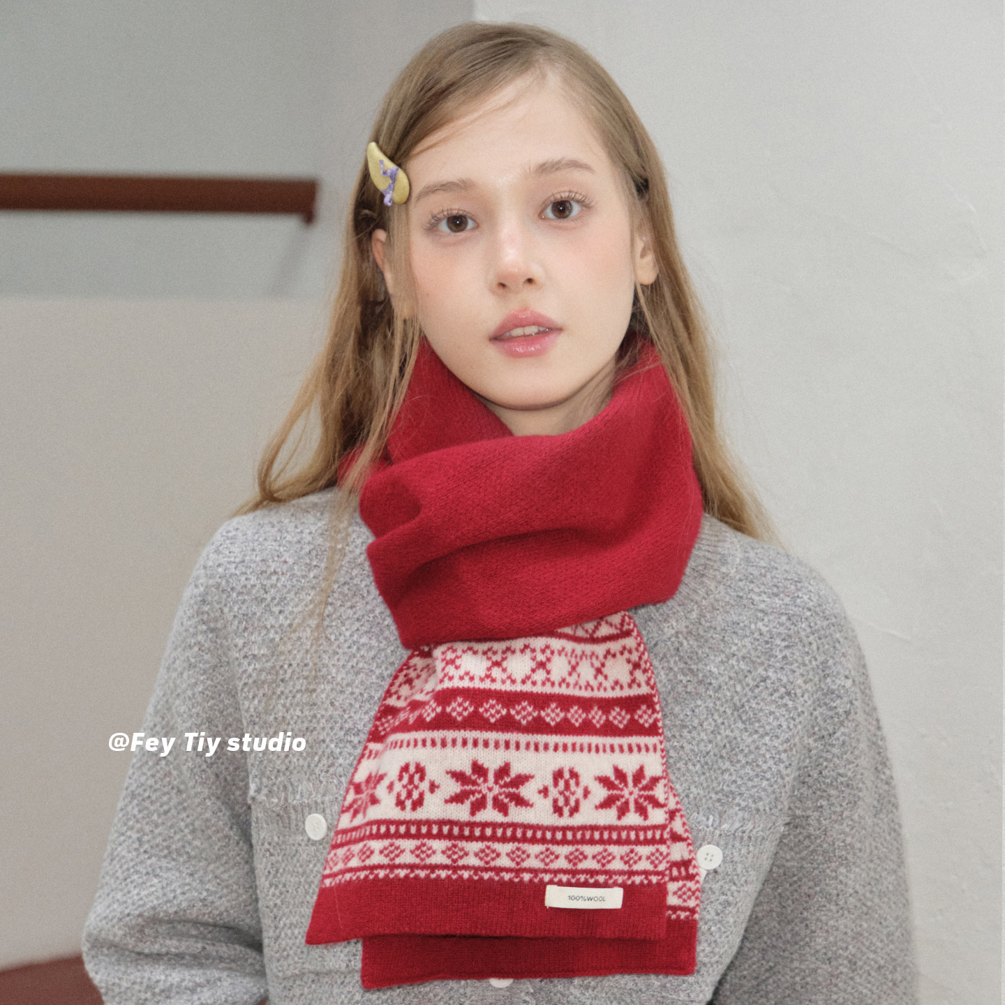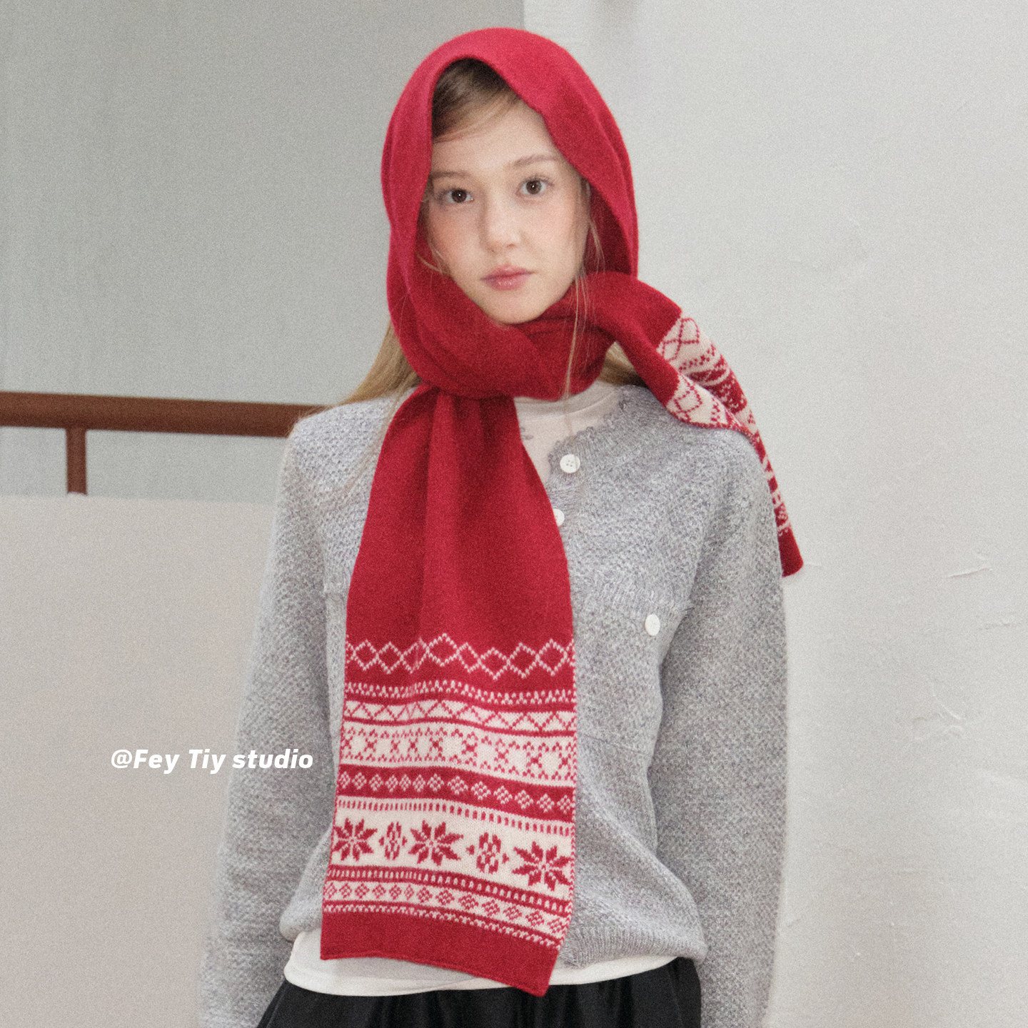 费尔岛雪花羊毛针织围巾女秋冬季 feytiy 100%wool 圣诞红保暖围脖