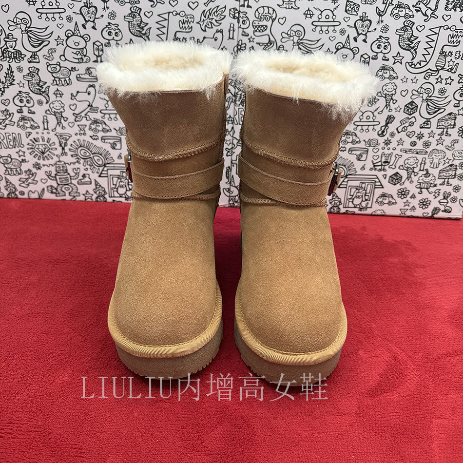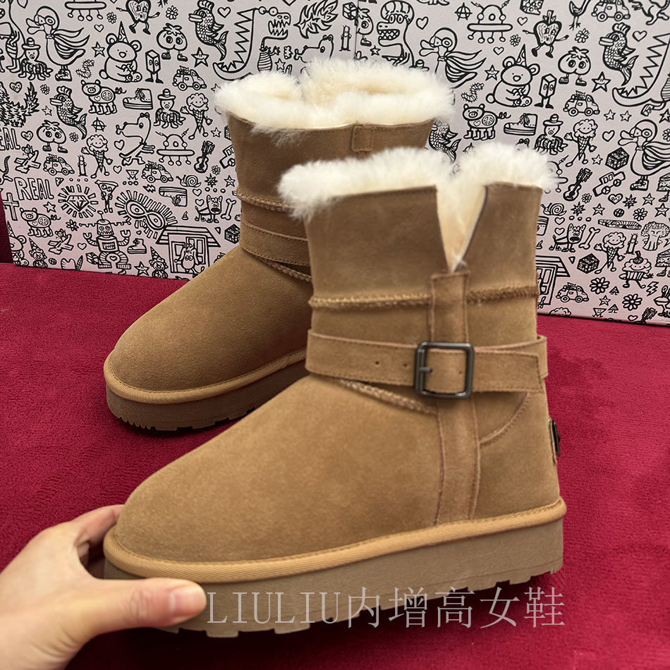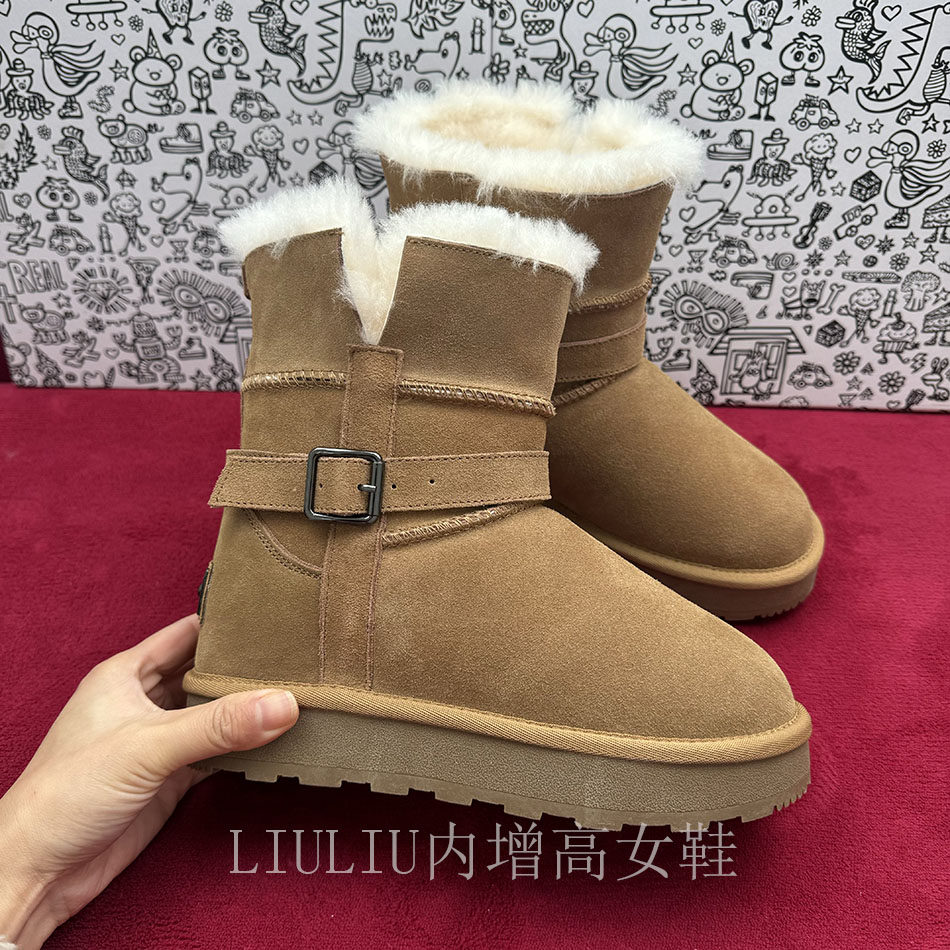 厚底雪地靴女冬季 隐形内增高7CM 加绒保暖短靴皮带扣驼色两棉靴