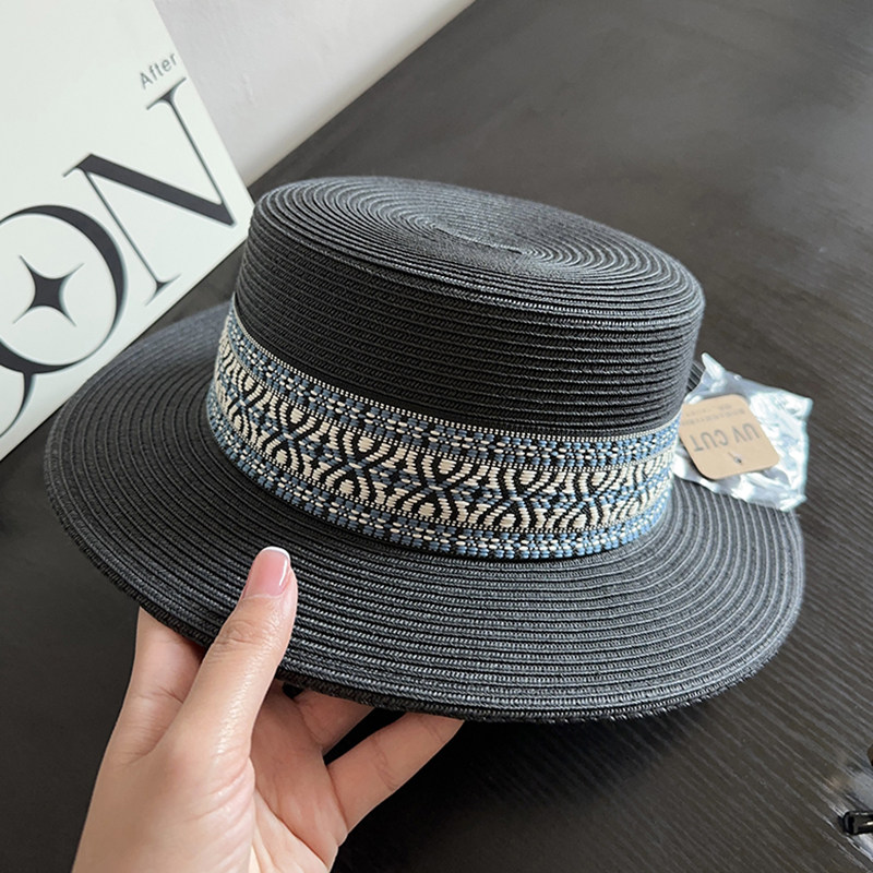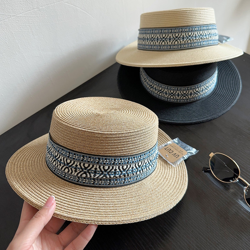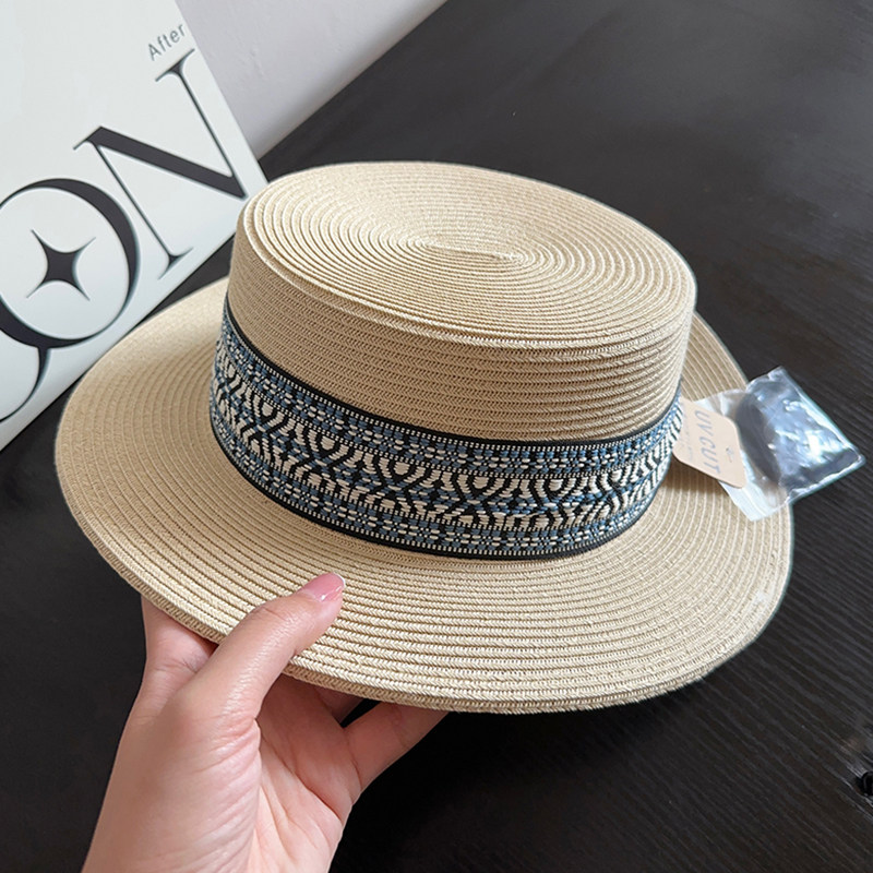 波西米亚民族风平顶草帽女夏季 防晒遮阳帽出游海边度假细草辫礼帽