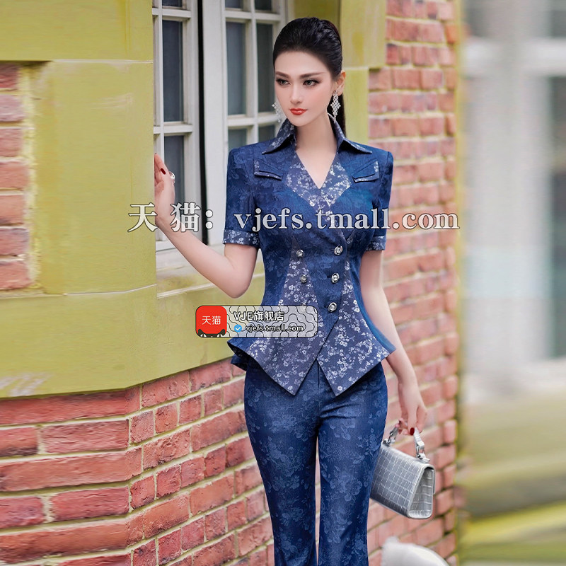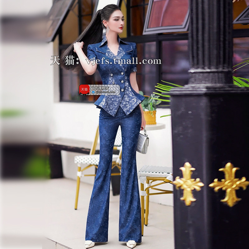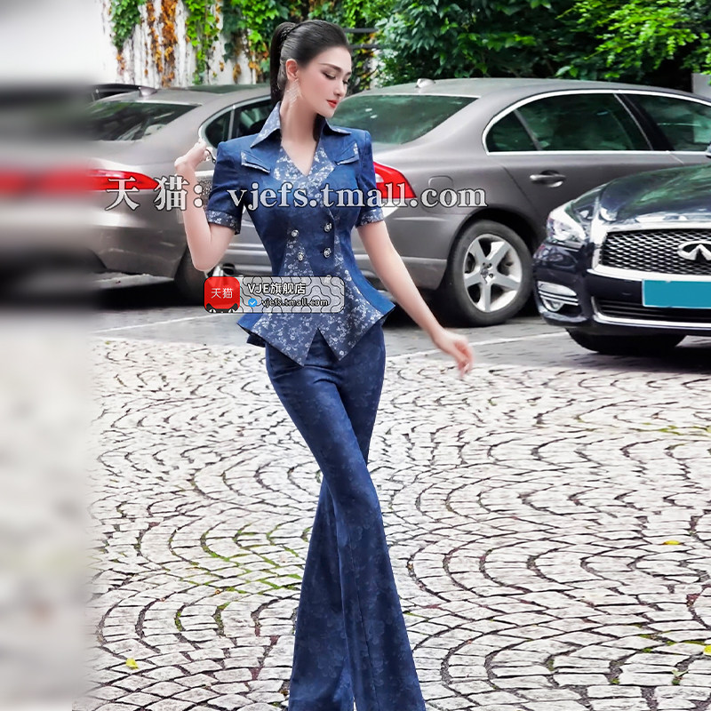 两件套夏季 新款 欧货时尚 仿牛仔印花拼接上衣喇叭裤 减龄套装