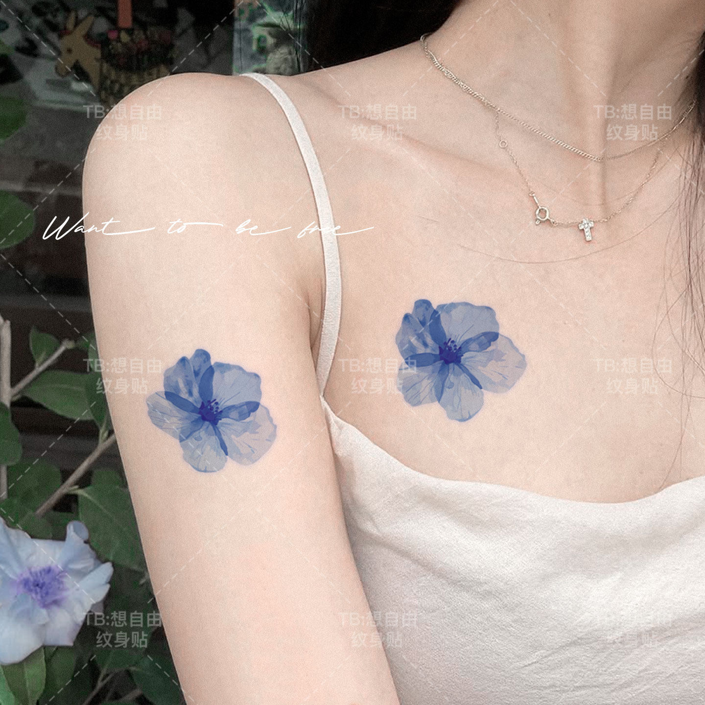 想自由蓝色花高级感唯美买一送一手腕锁骨彩色纹身贴防水持久贴纸