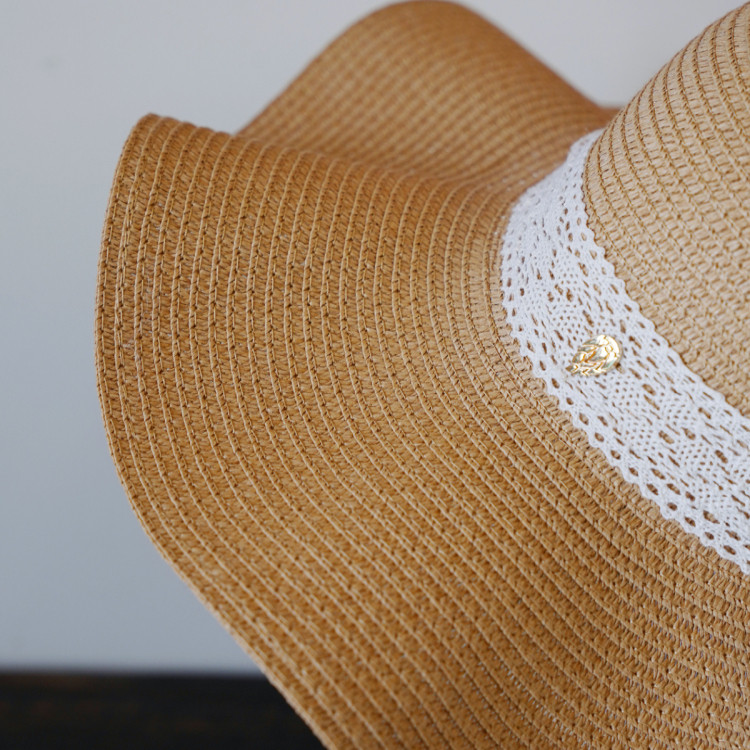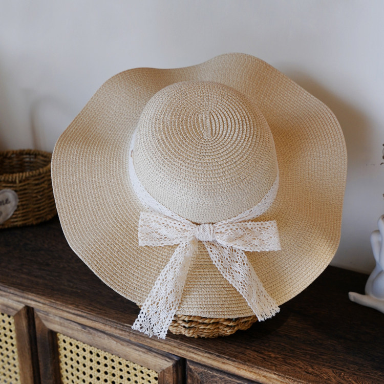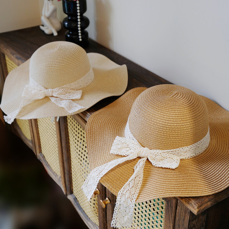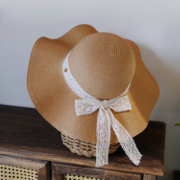 法式 2025夏季 新款 蕾丝系带波浪边防晒草帽沙滩海边遮阳草编帽子