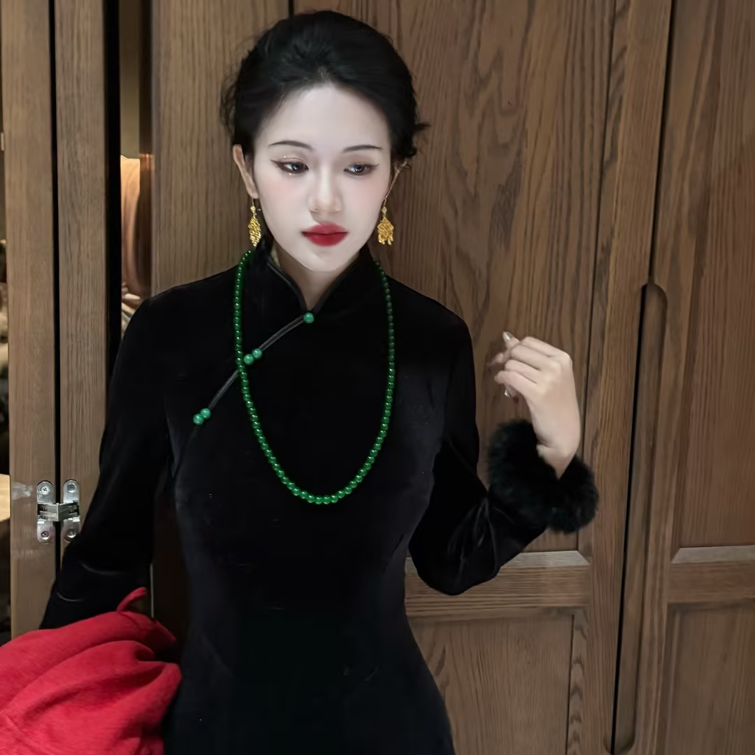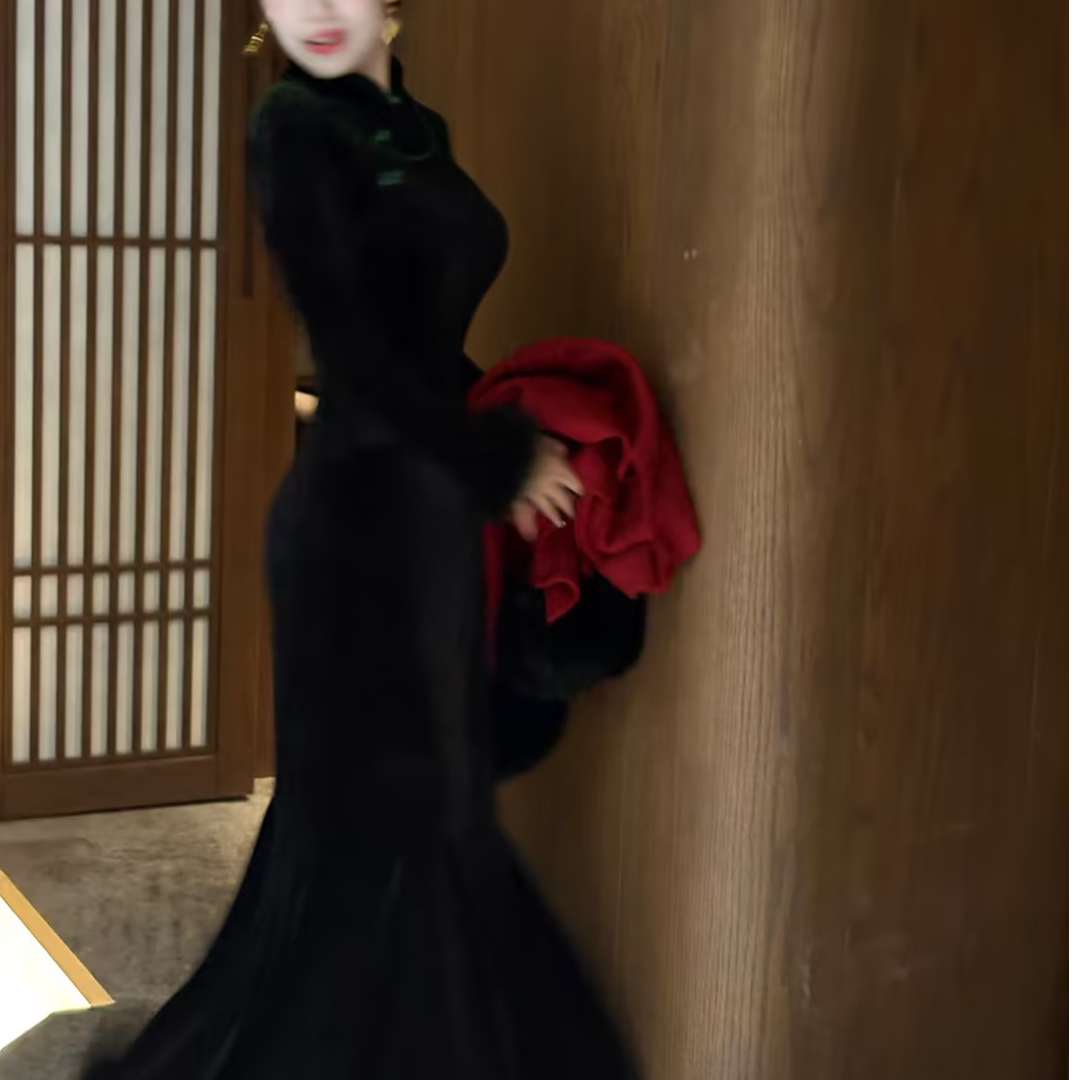 画报夫人原创重工丝绒兔毛鱼尾步步生莲新式 旗袍 忘川迷雾