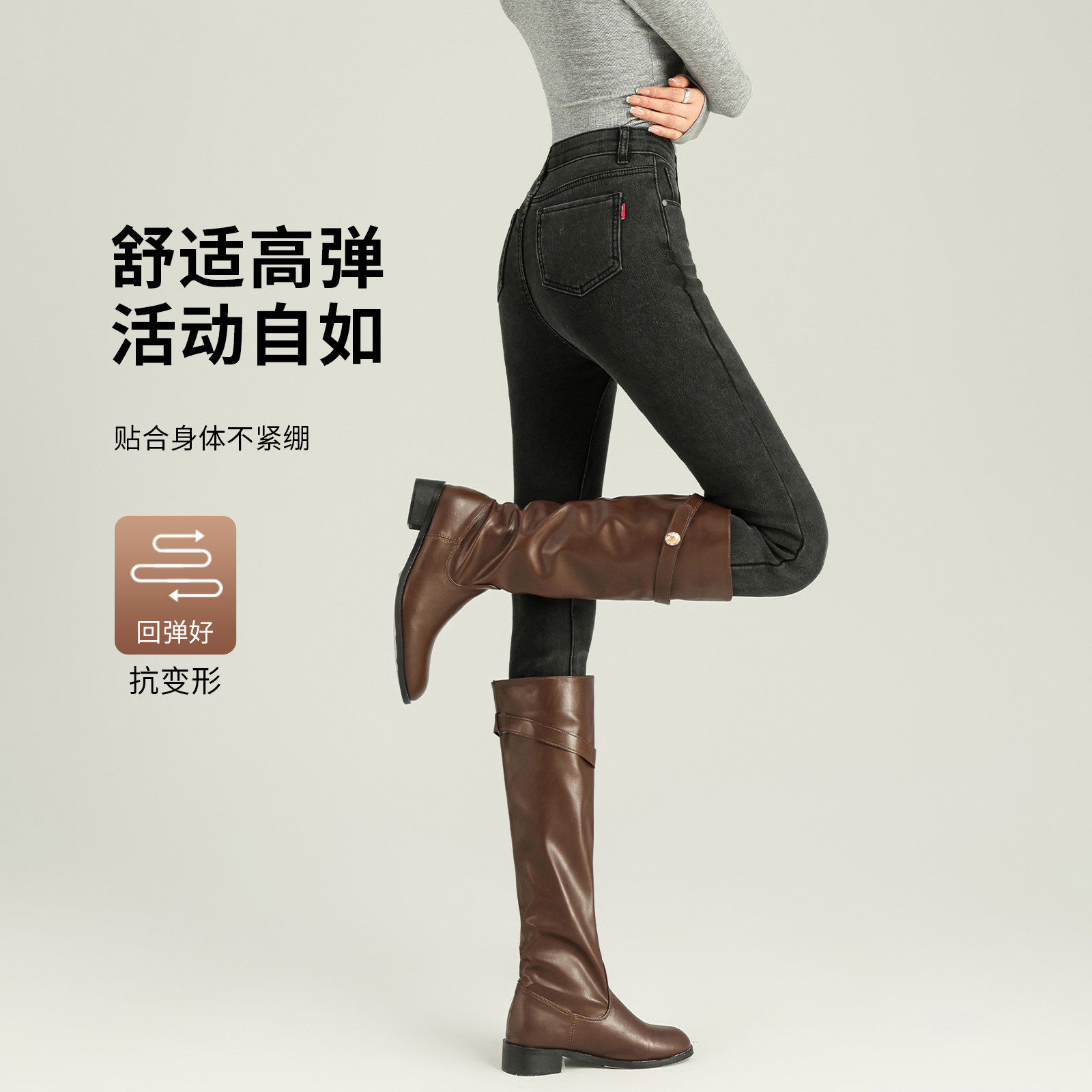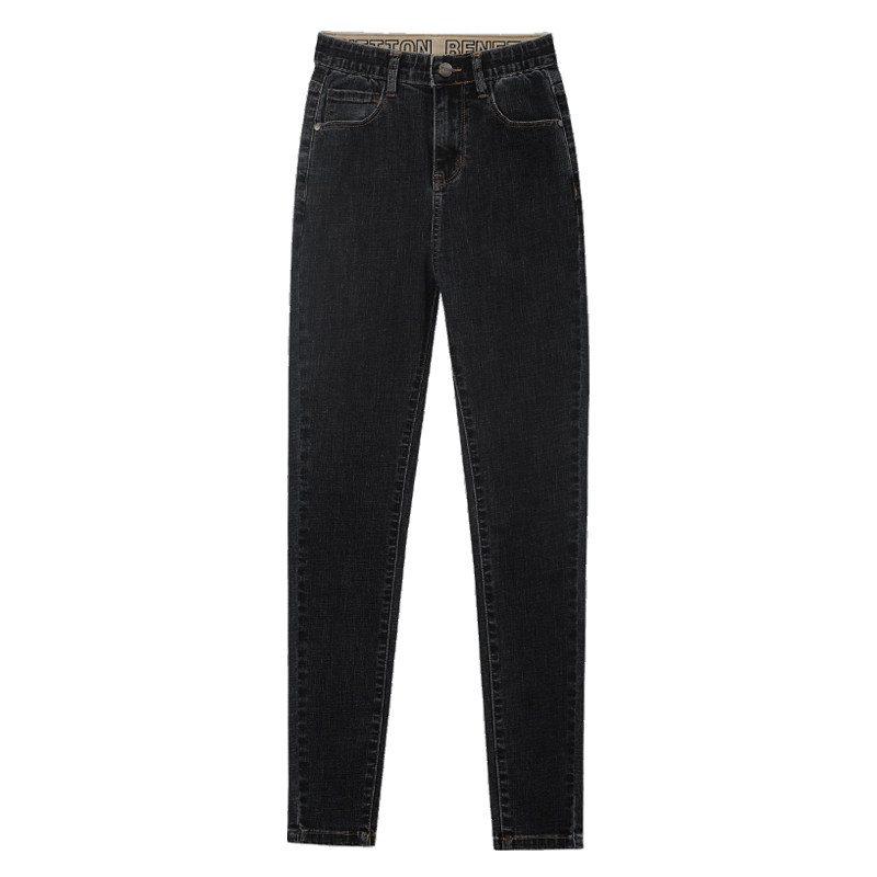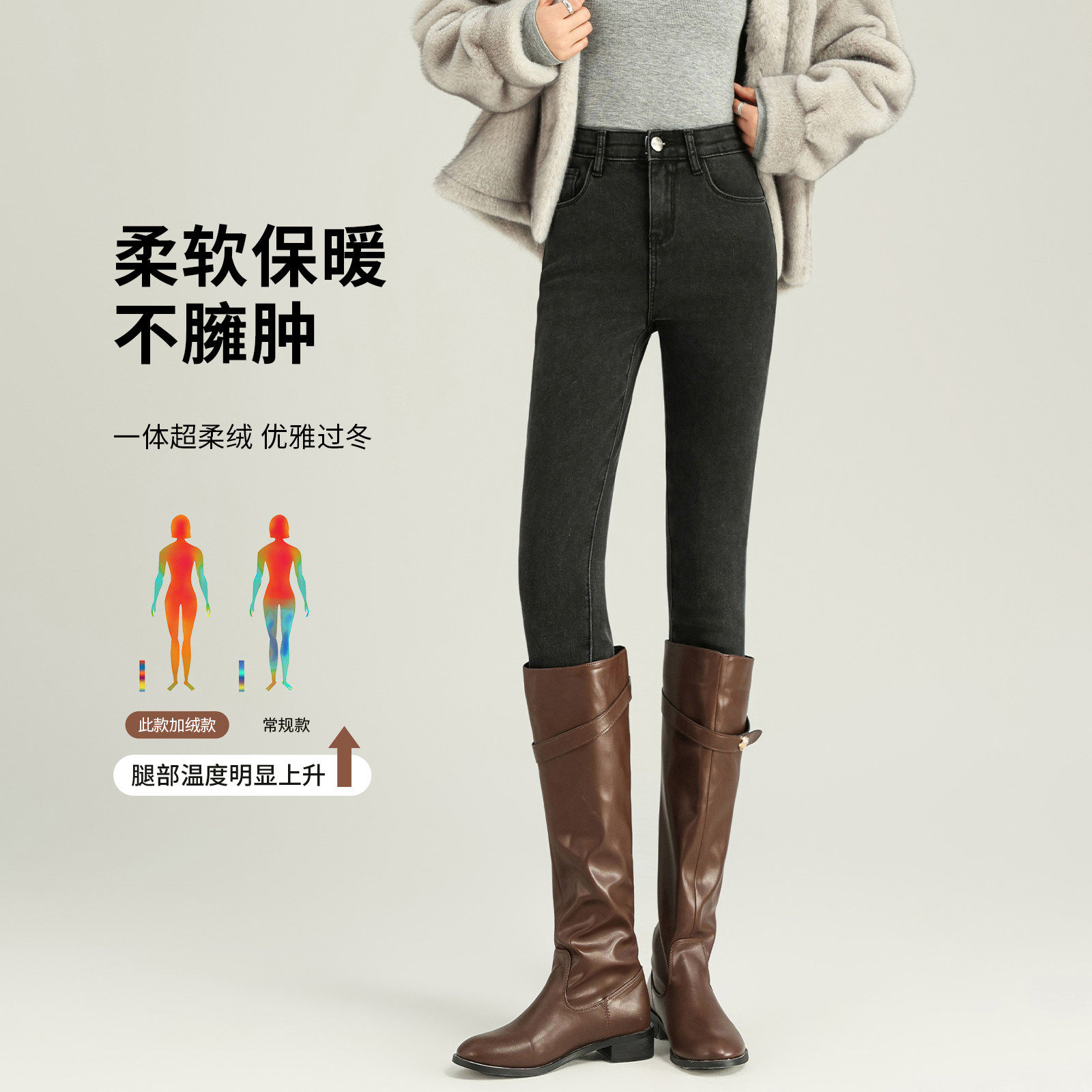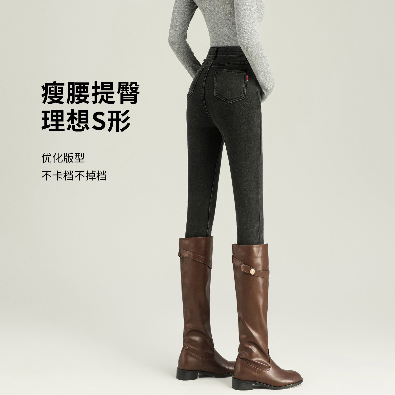 黑灰色牛仔裤 冬加厚高腰紧身配靴子加绒铅笔裤 小脚修身 女2026新款
