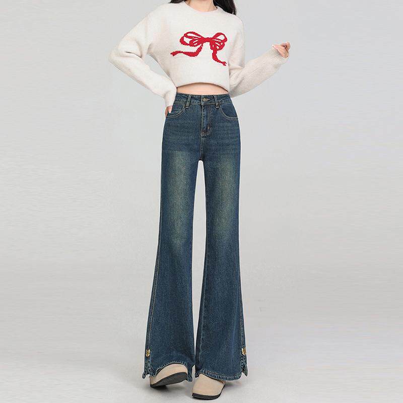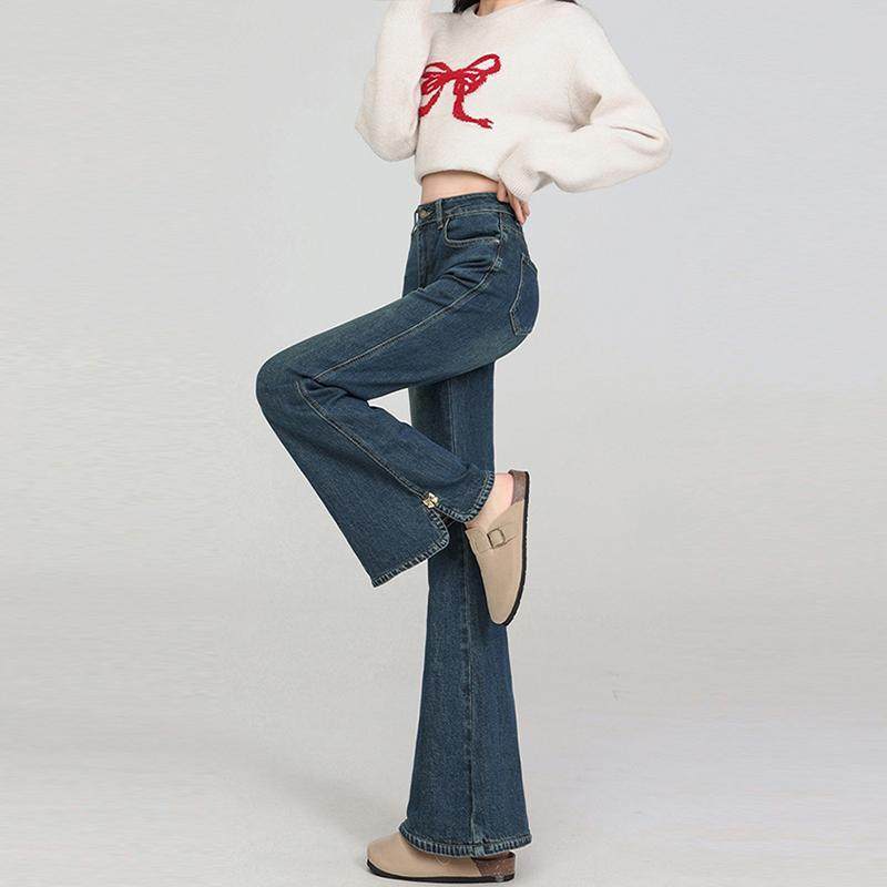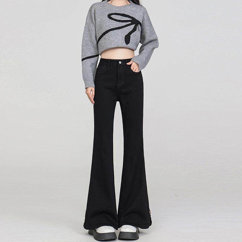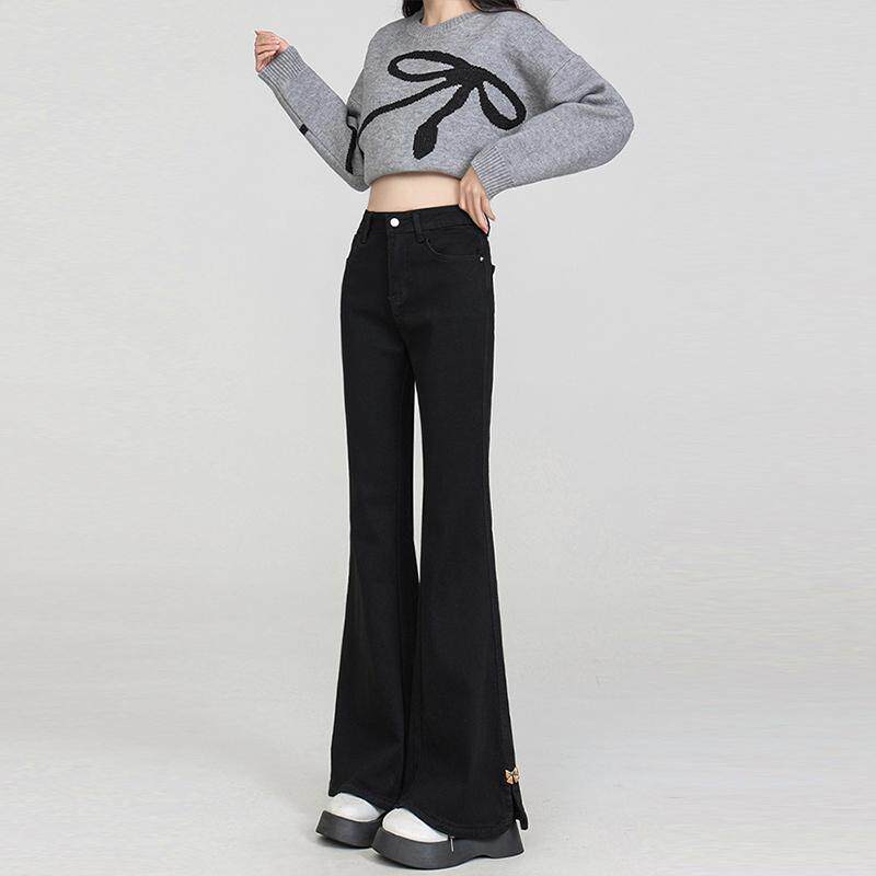 女裤 300斤大码 女胖mm新款 弹力显瘦喇叭裤 女装 复古开叉微喇牛仔裤
