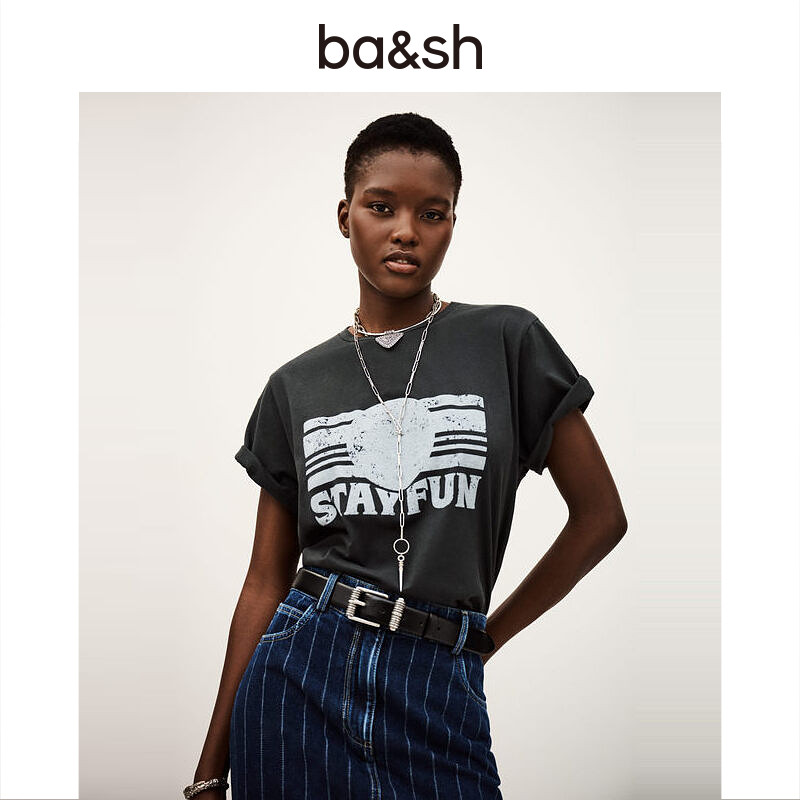 谭松韵同款 bash春季 法式 复古休闲印花棉质短袖 T恤女1H25REES