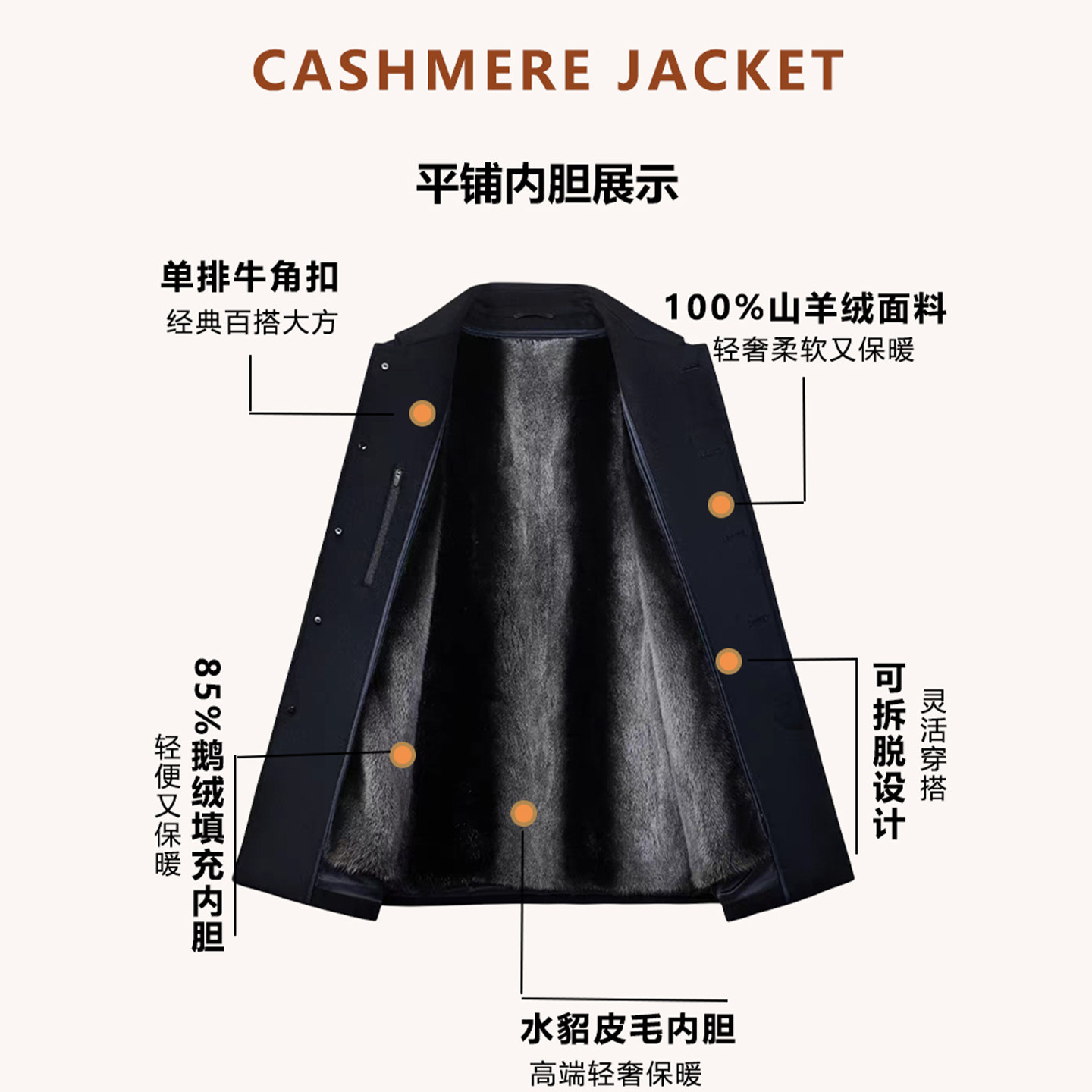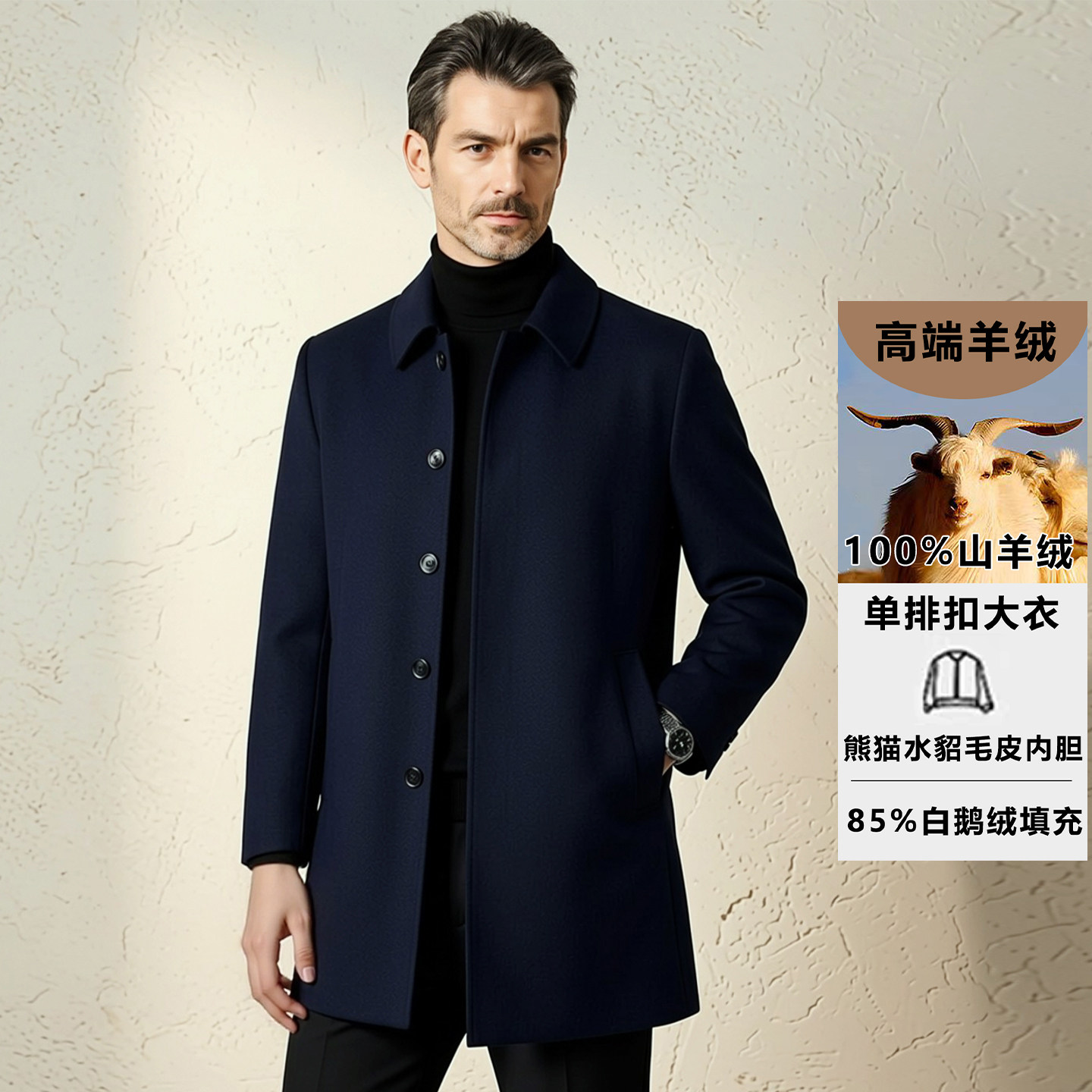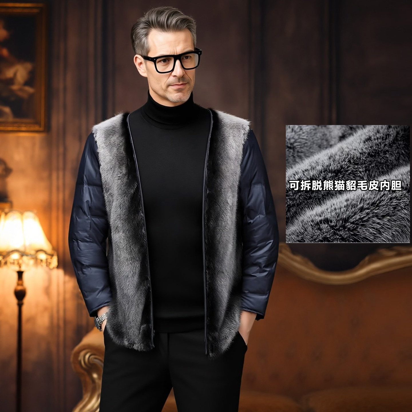 整貂熊猫水貂毛皮内胆100%羊绒大衣男单排扣中长款 可脱卸鹅绒外套