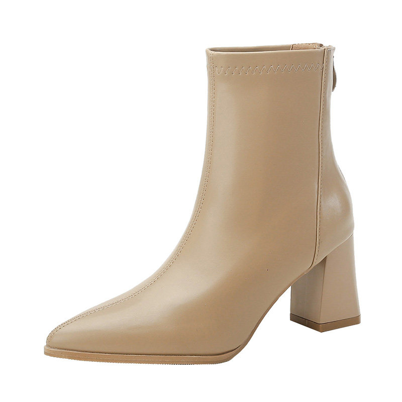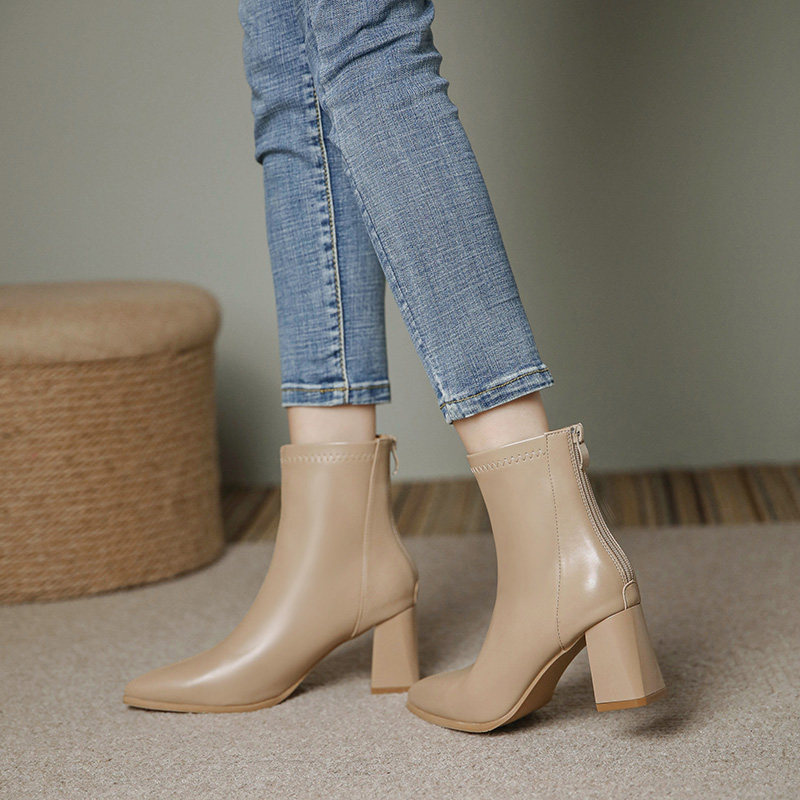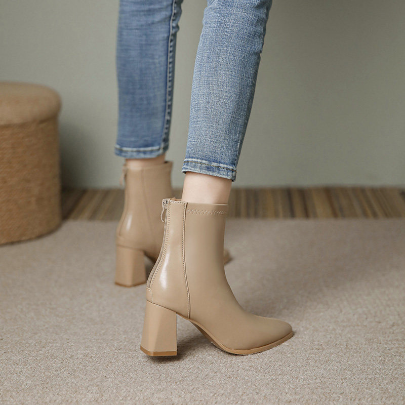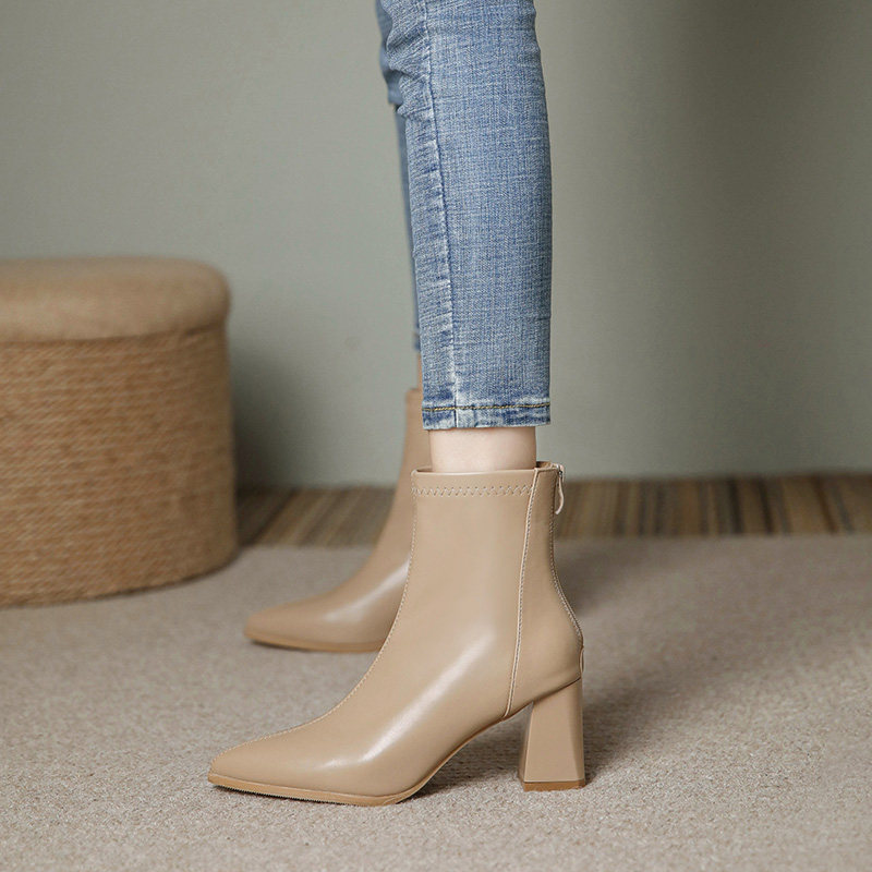 加绒显瘦爆款 裸色软皮尖头粗跟短靴女2025秋冬新款 高跟鞋 瘦瘦靴子