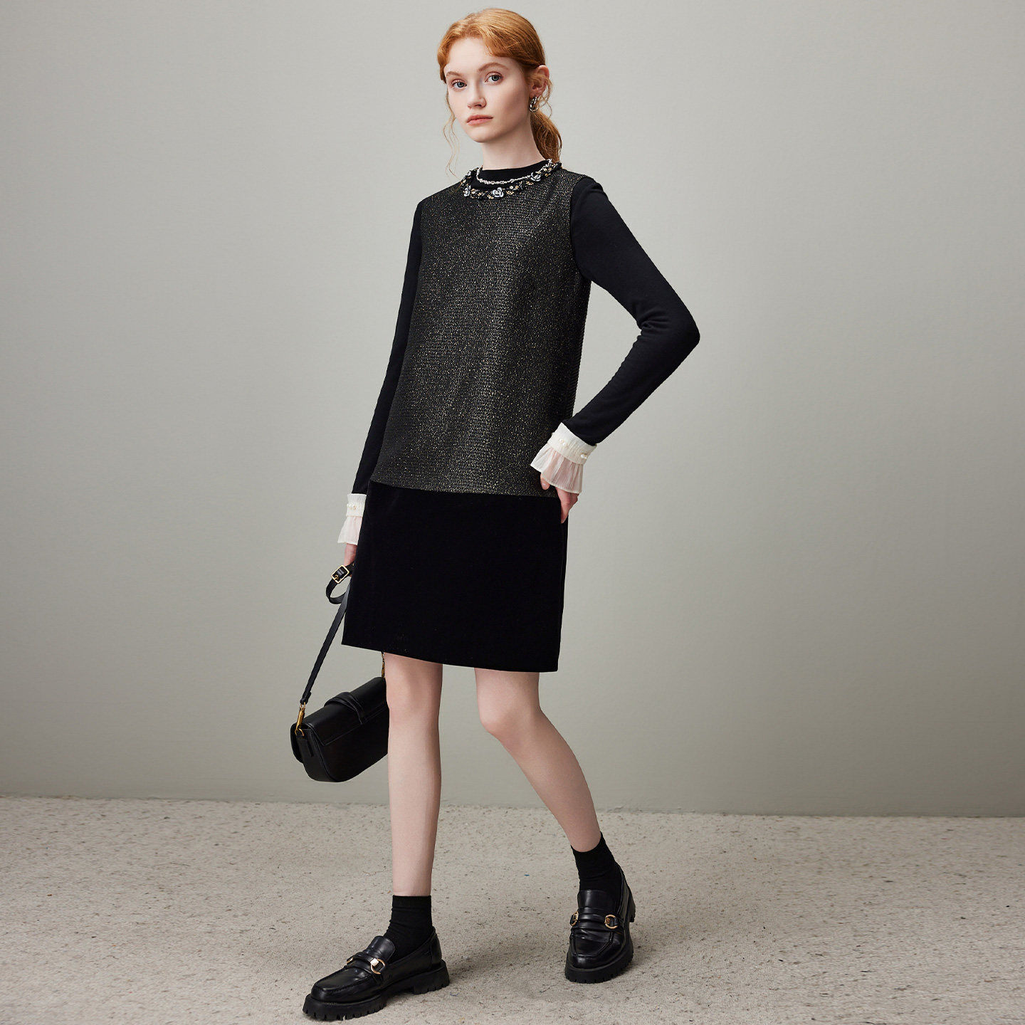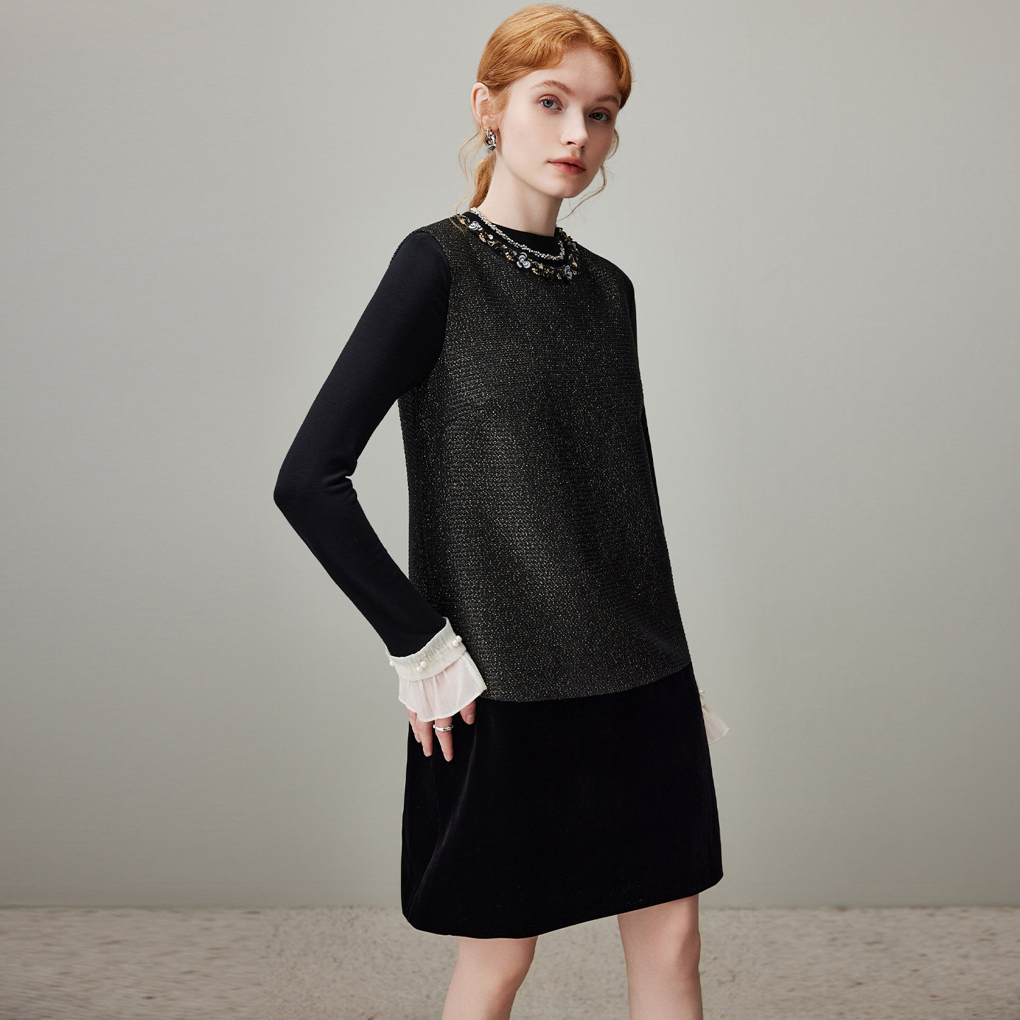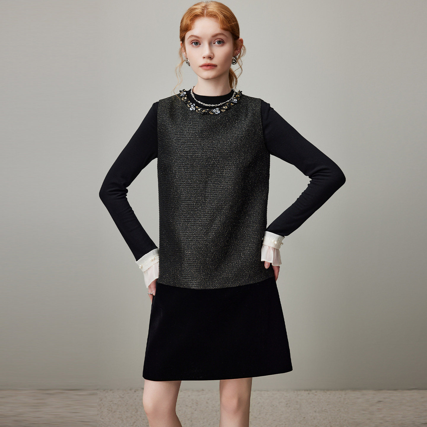 新款 dfvc气质背心裙丝绒拼接无袖 连衣裙女2025年冬季 小个子小黑裙