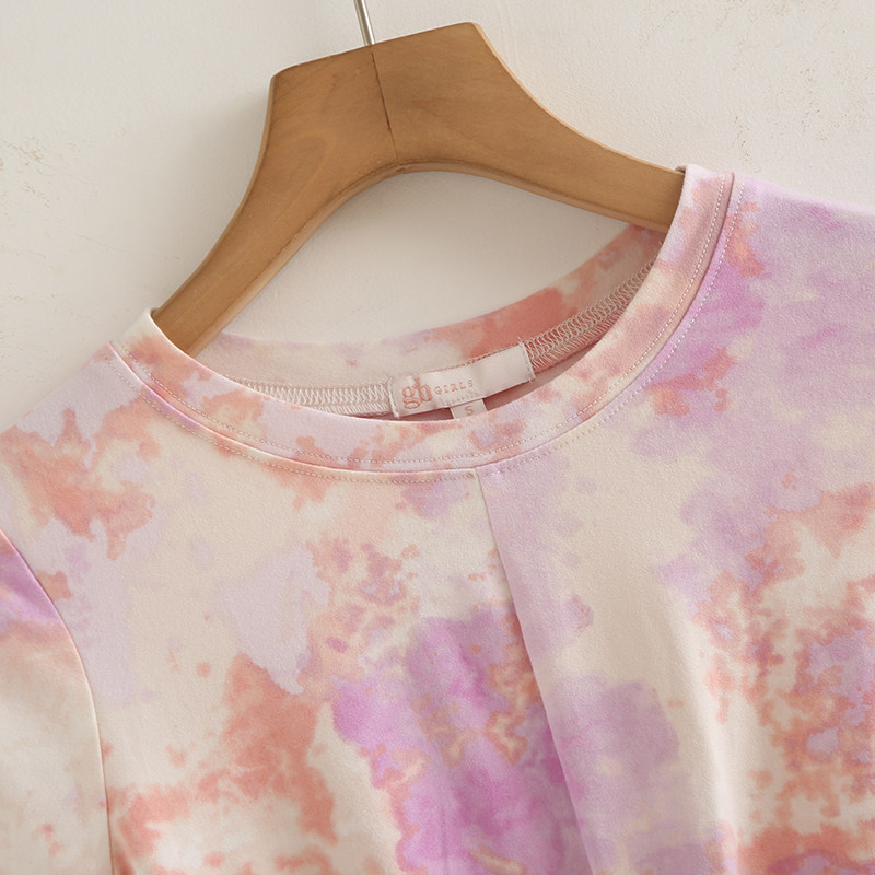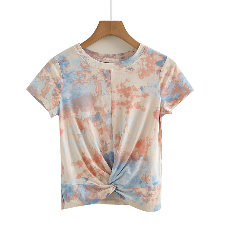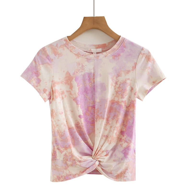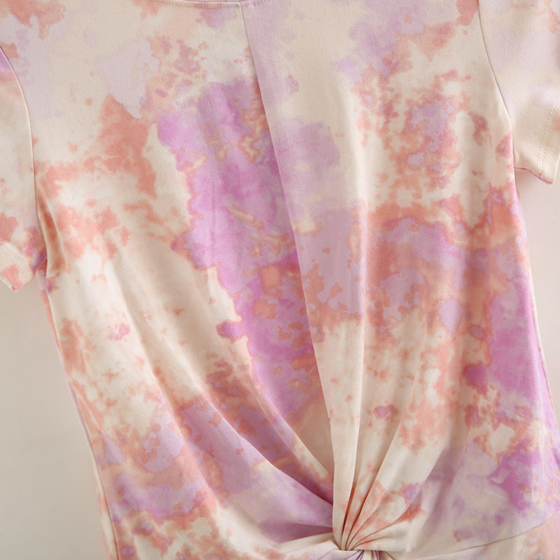 外贸女夏季 洋气打结晕染t恤设计感圆领修身 短袖 母子装 小衫 上衣