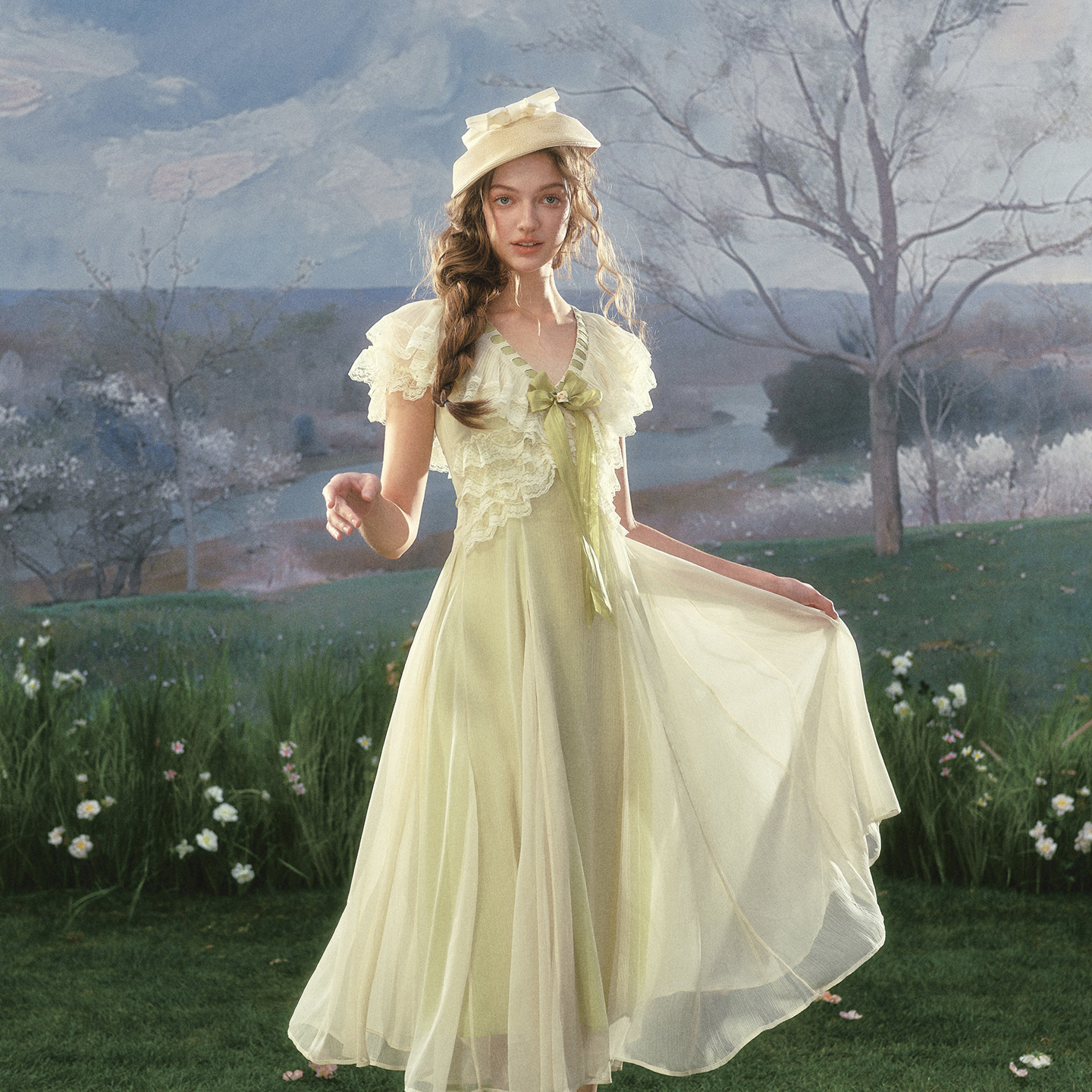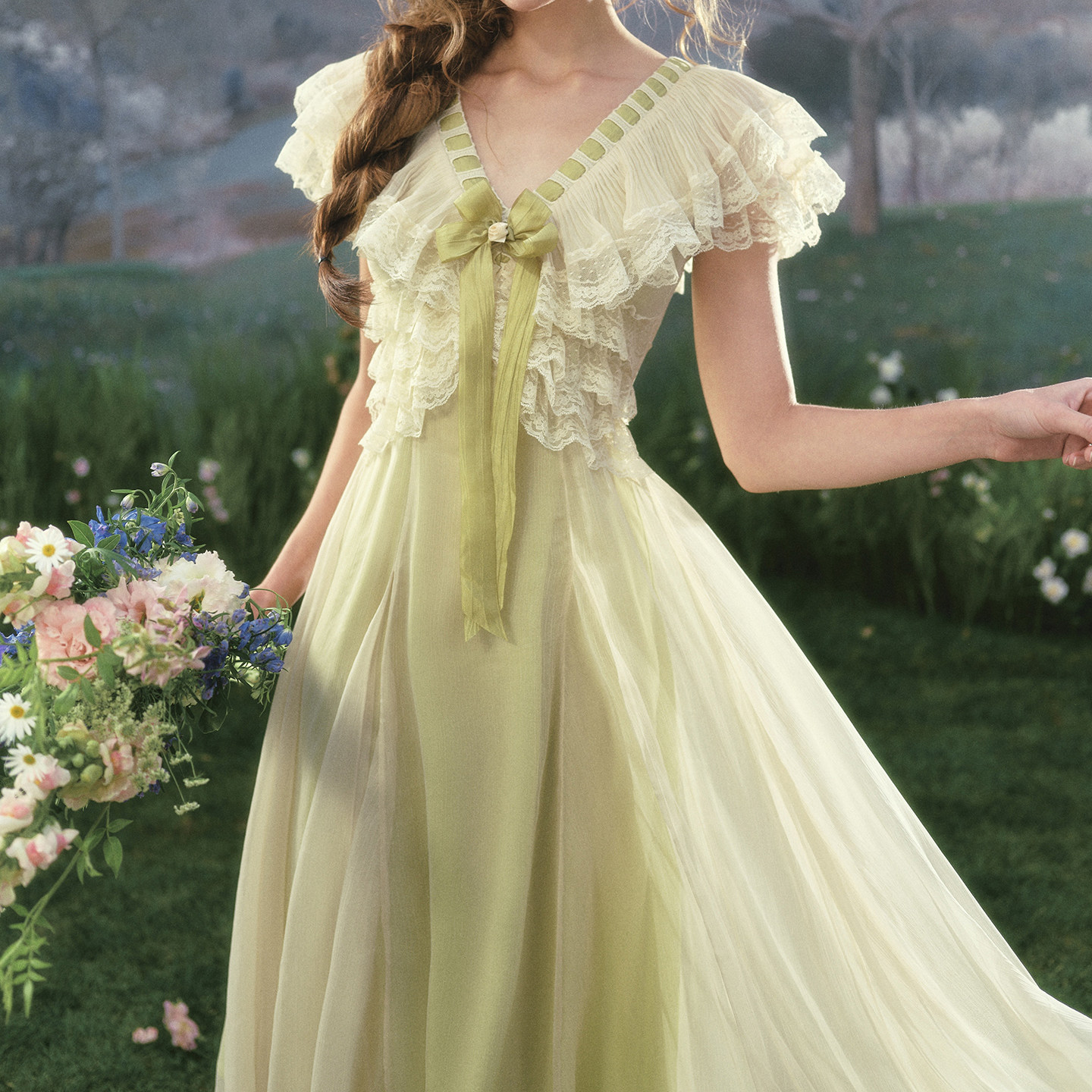 法式 LaceMade 春日踏青 田园设计感仙女裙蕾丝绿色公主裙连衣裙女