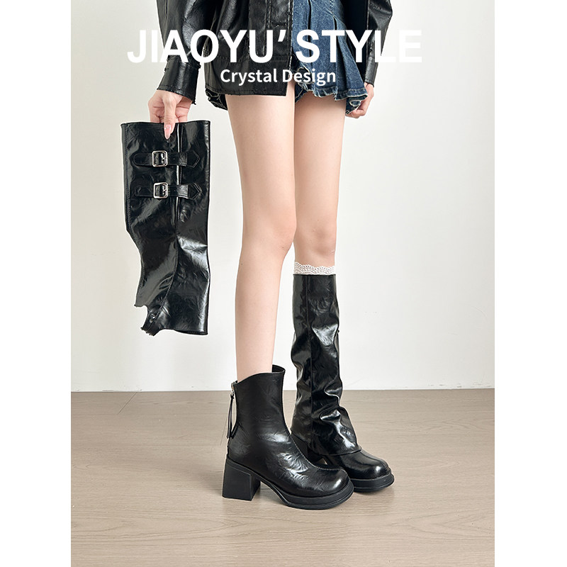 真皮 骄屿可拆长筒靴女2025秋冬新款 两穿长靴厚底粗跟堆堆靴短靴
