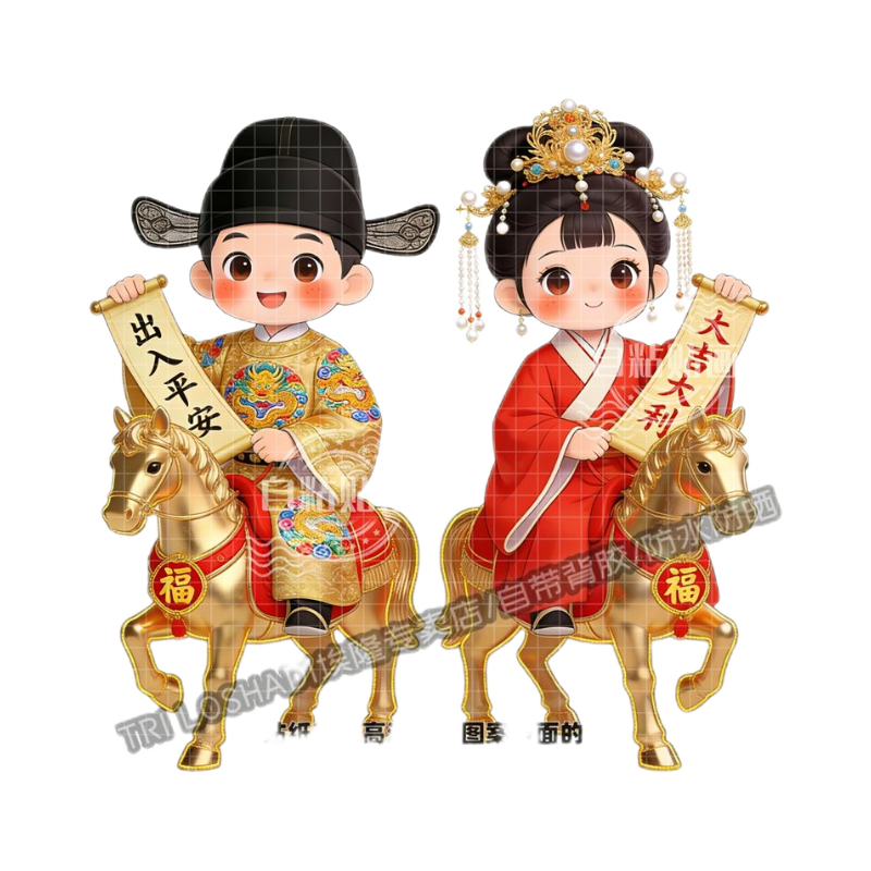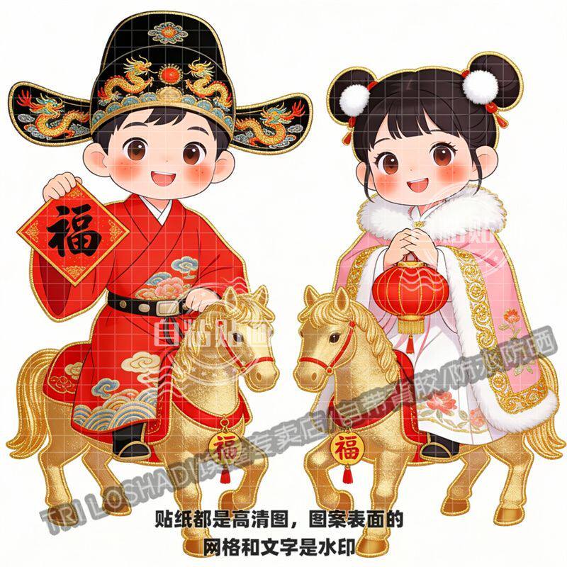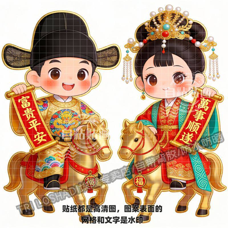 富贵平安华丽汉服金童玉女门贴墙上门窗过年喜庆年画冰箱车贴防水