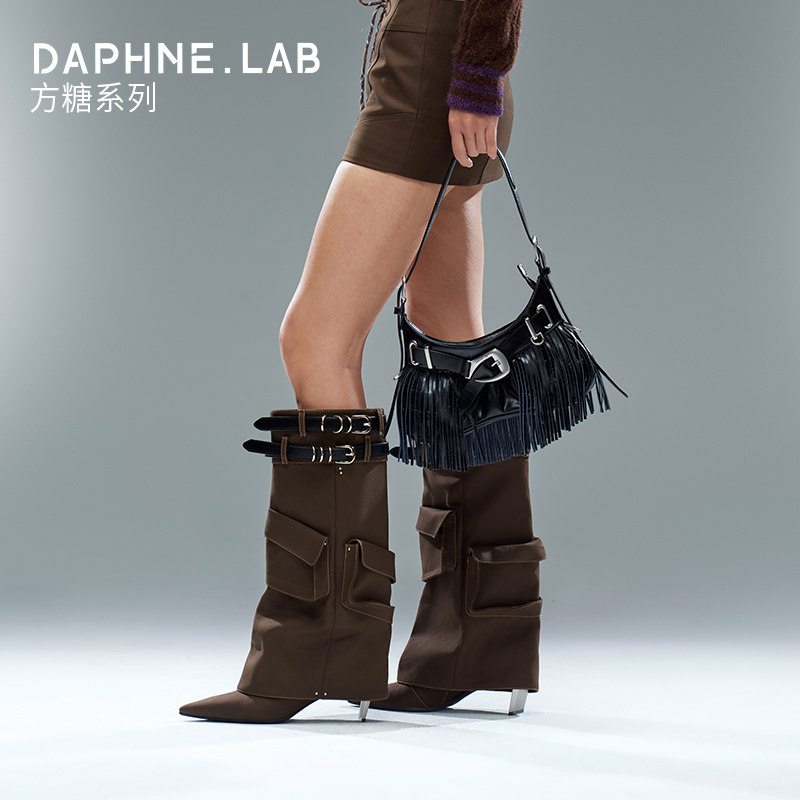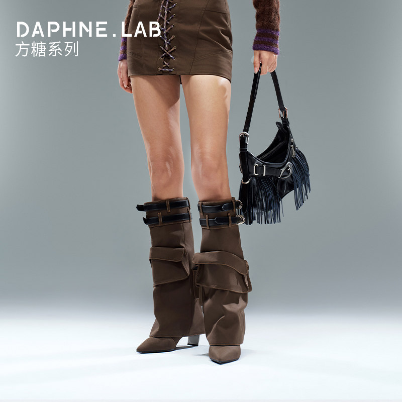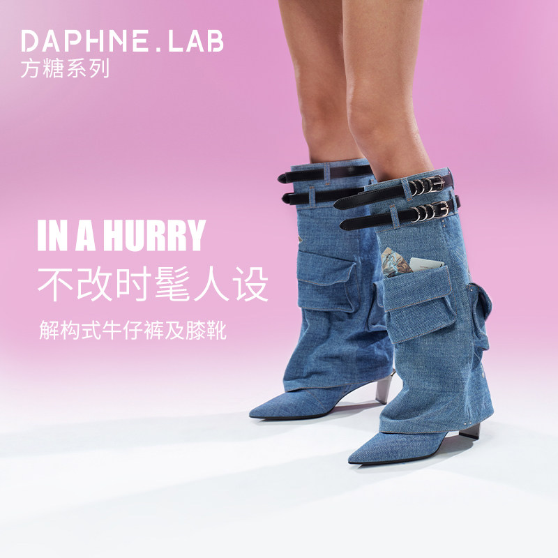 DAPHNE LAB方糖牛仔口袋及膝靴复古骑士高跟鞋 裤 宋茜同款 管靴女鞋