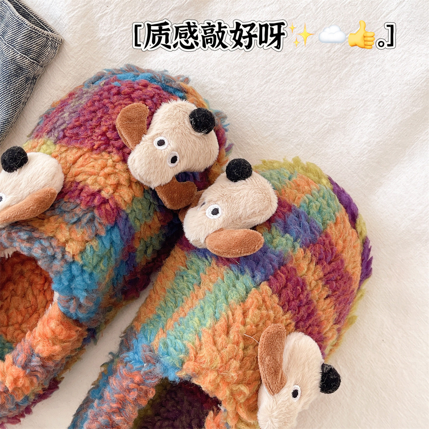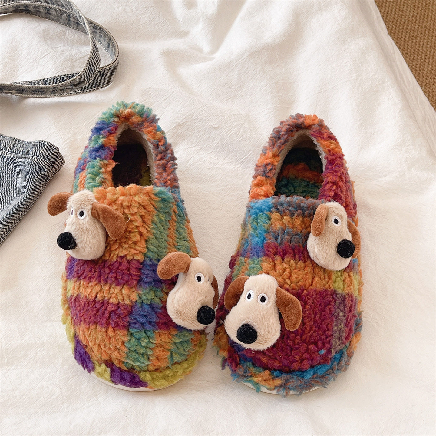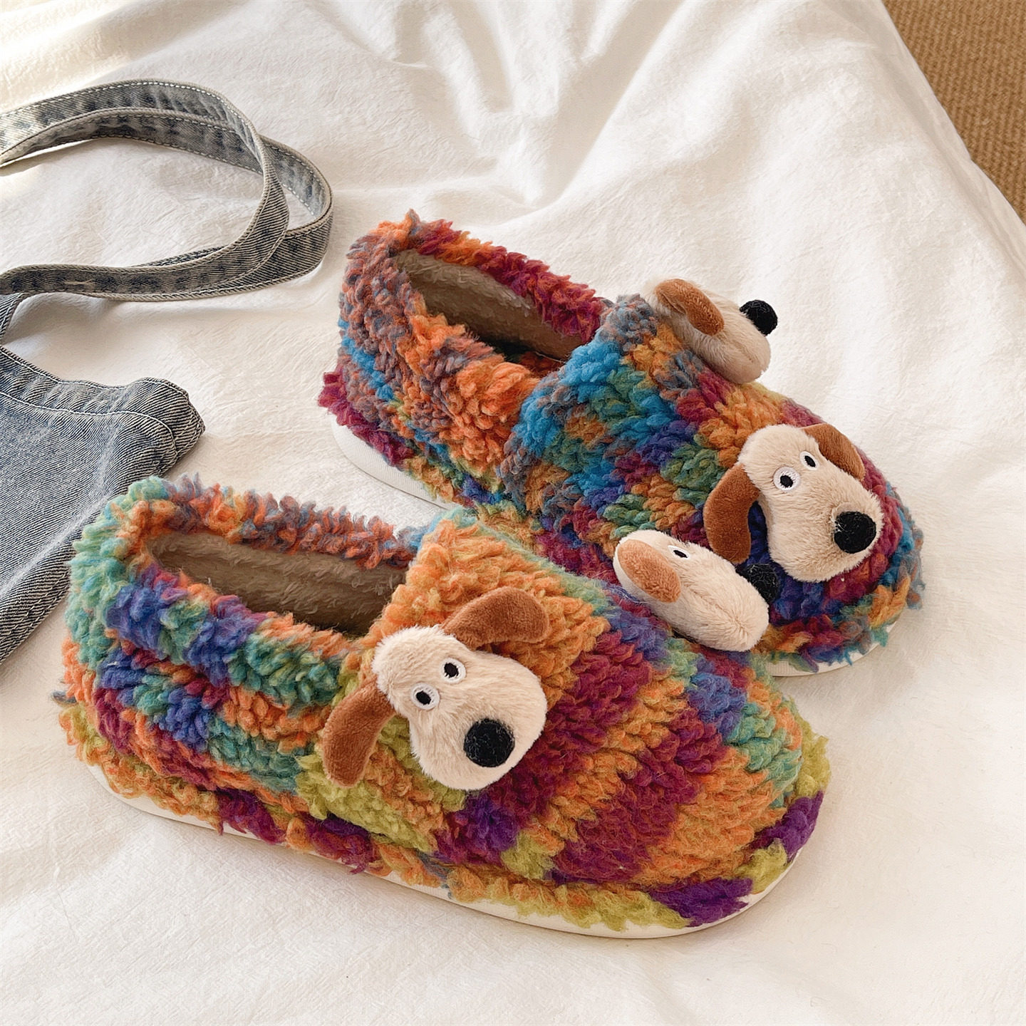 室内居家保暖包跟厚底防滑毛绒棉拖鞋 卡通可爱小狗拼色棉鞋 女冬季