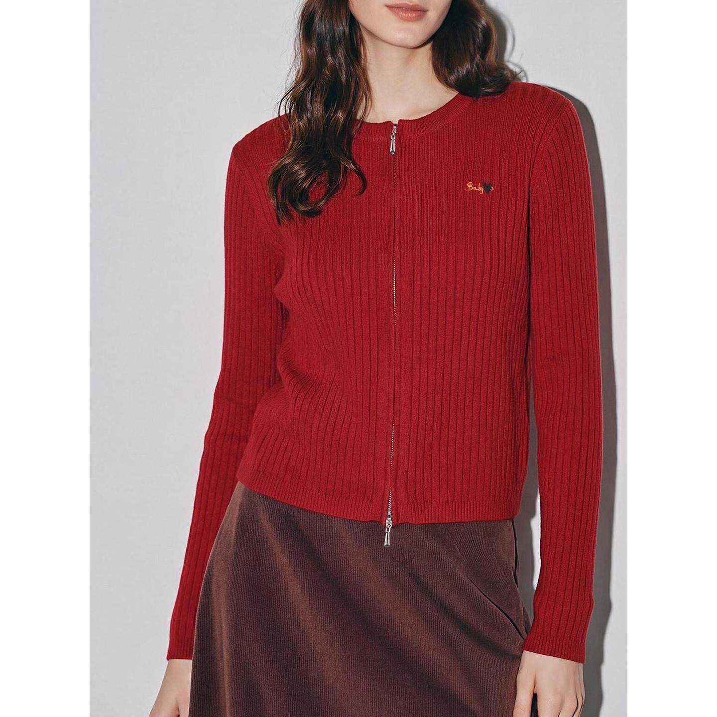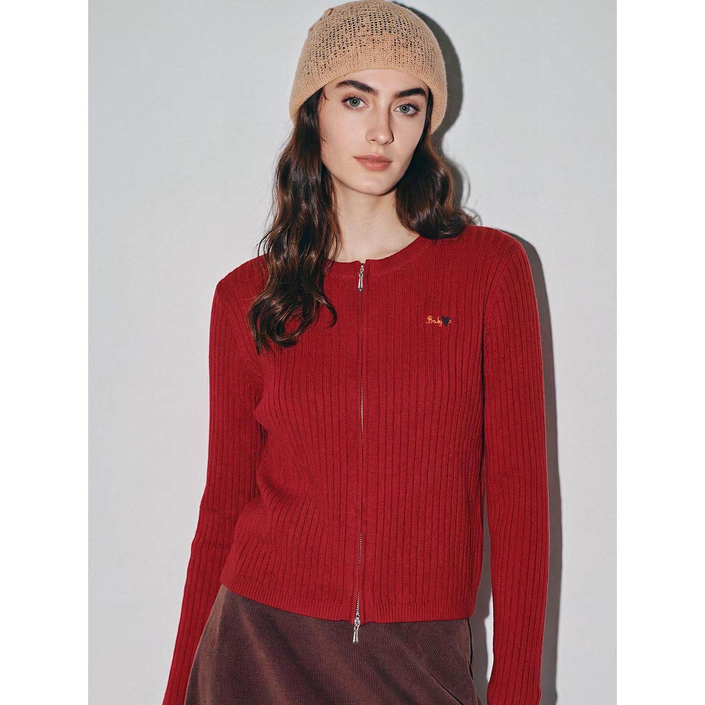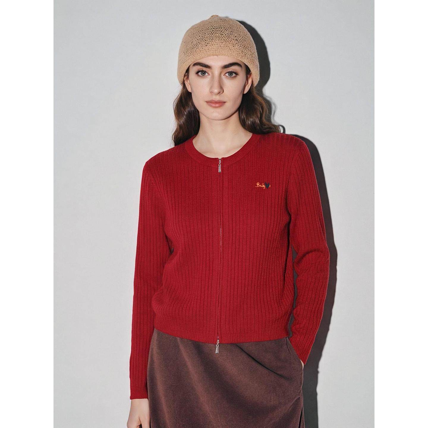 House 百家好红色刺绣针织开衫 女2026春季 Basic 新款 坑条圆领毛衣