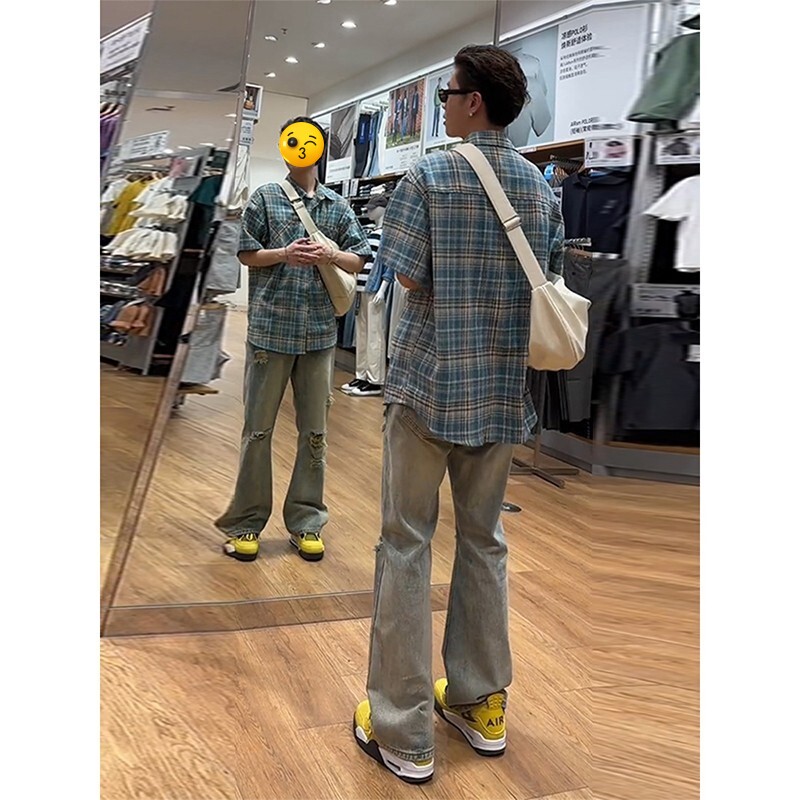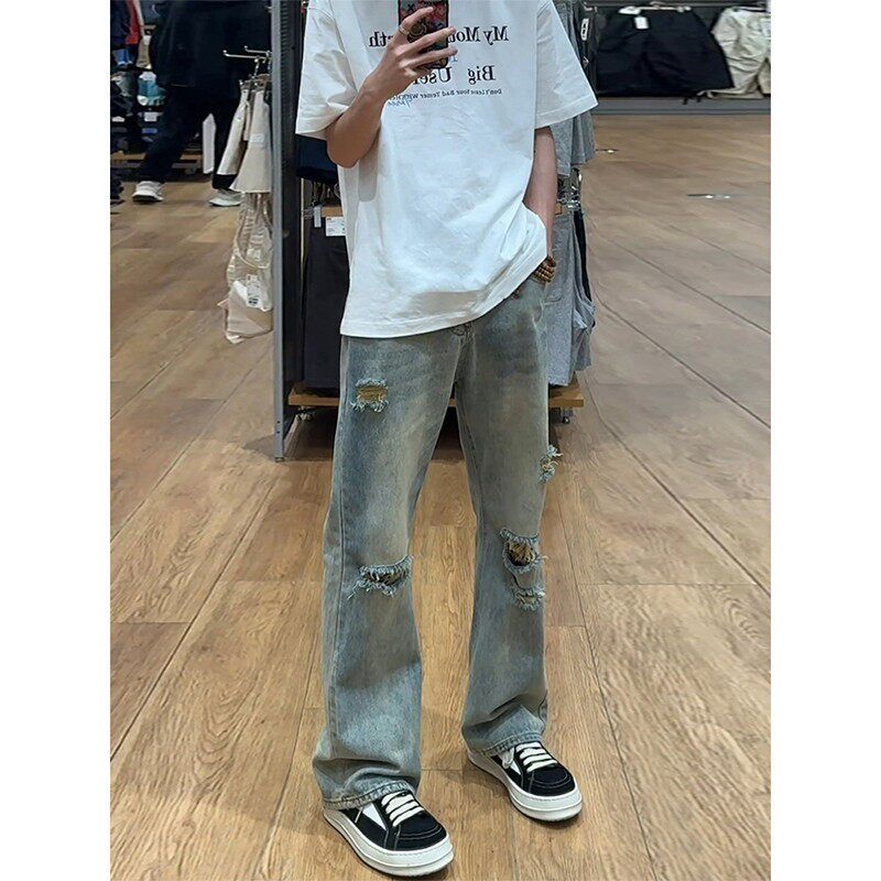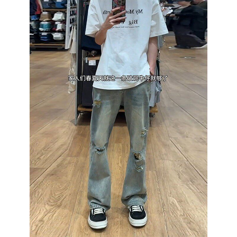 子直筒高个子显瘦微喇裤 复古蓝破洞牛仔裤 美式 vibe裤 男款 春秋新款