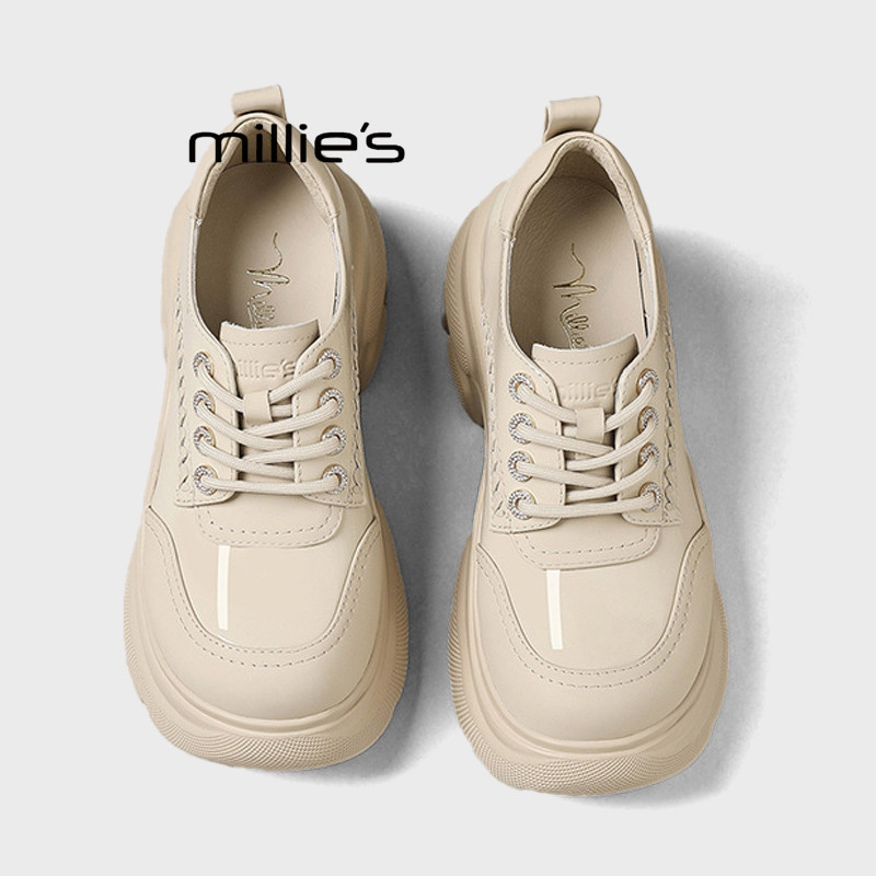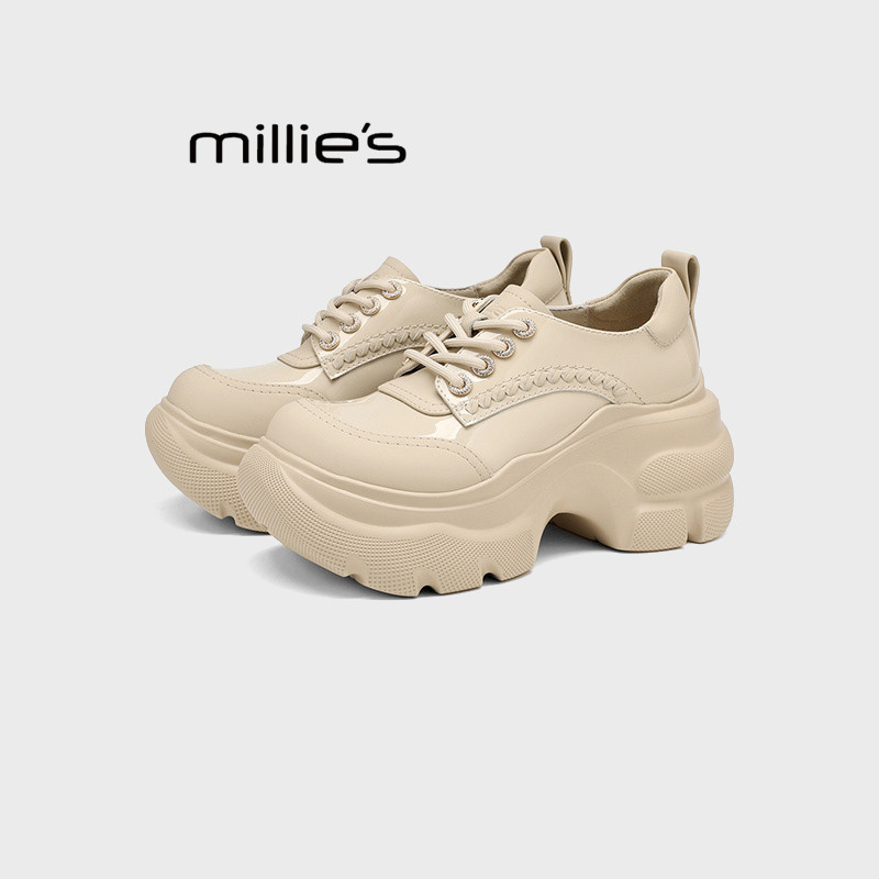 厚底鞋 MILLIE 女米色粗跟防水鞋 春季 妙丽英伦风厚底系带雨鞋