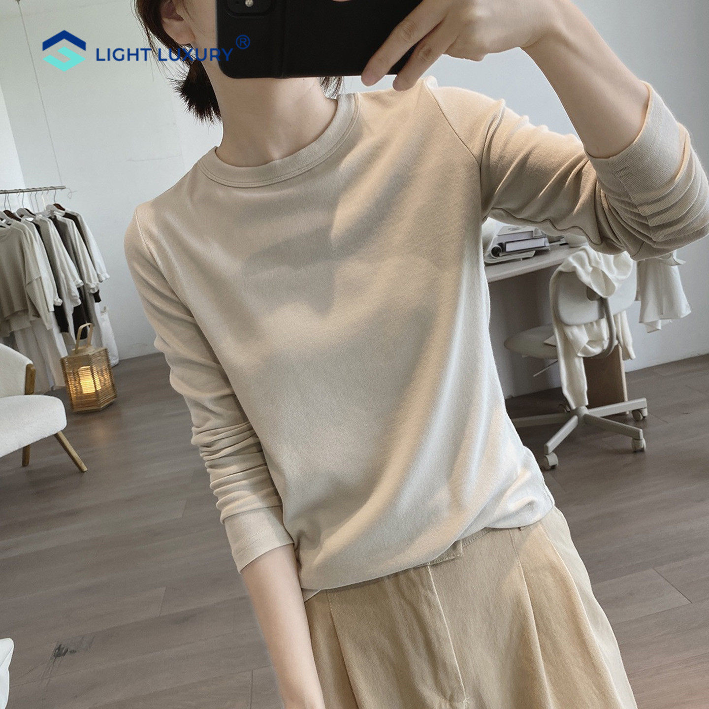 咖色磨毛加厚打底衫 t恤 内搭高级纯色圆领长袖 女欧货修身 简约短款