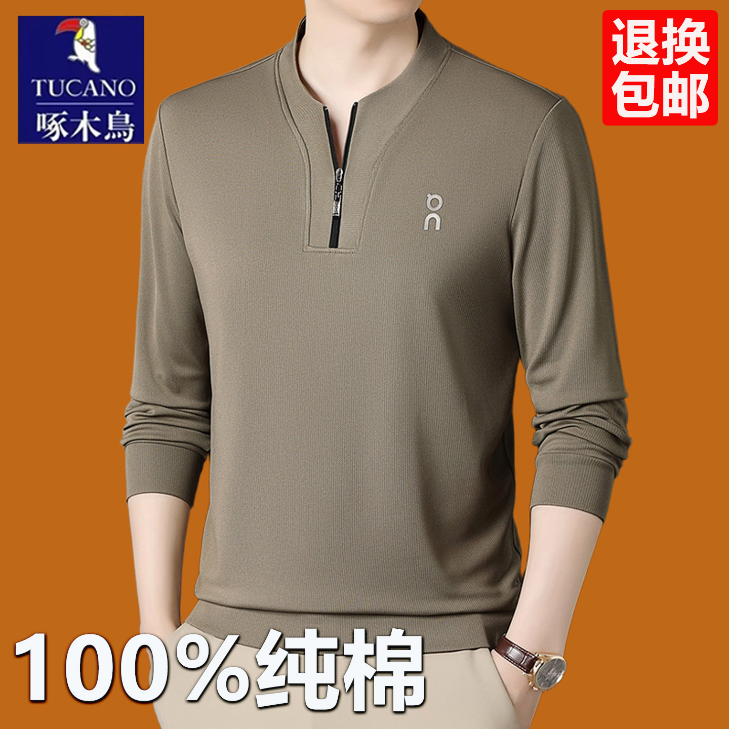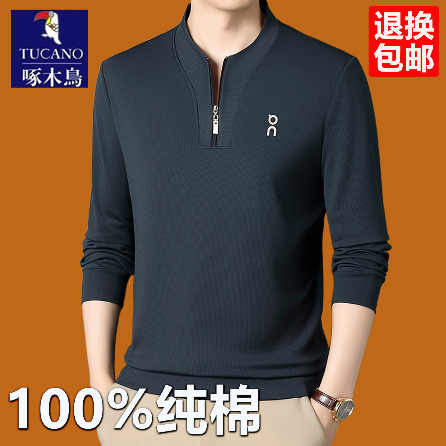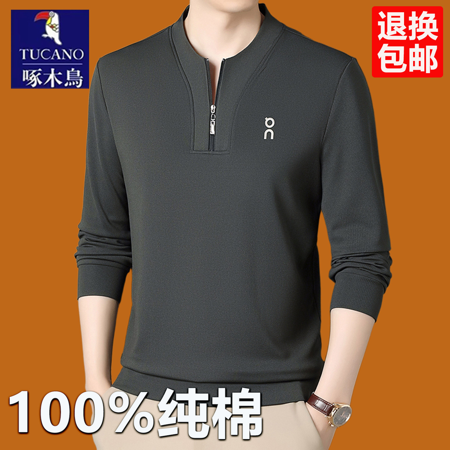 啄木鸟男士 休闲宽松体恤中老年拉链卫衣T 春秋季 纯棉长袖 t恤polo衫