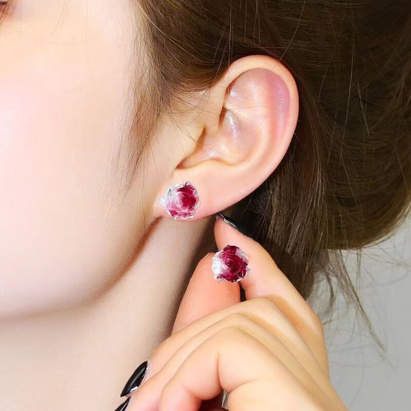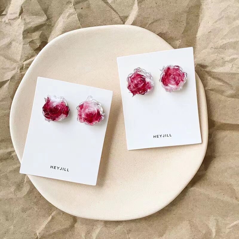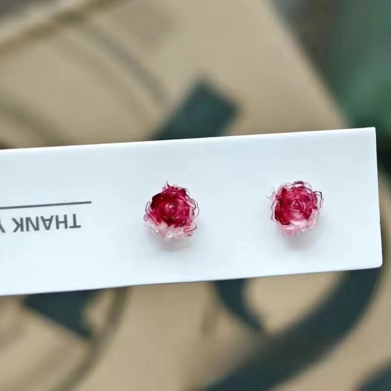 新款 小众干枯玫瑰花耳钉女抗过敏树脂耳针温柔甜美渐变山茶花耳饰